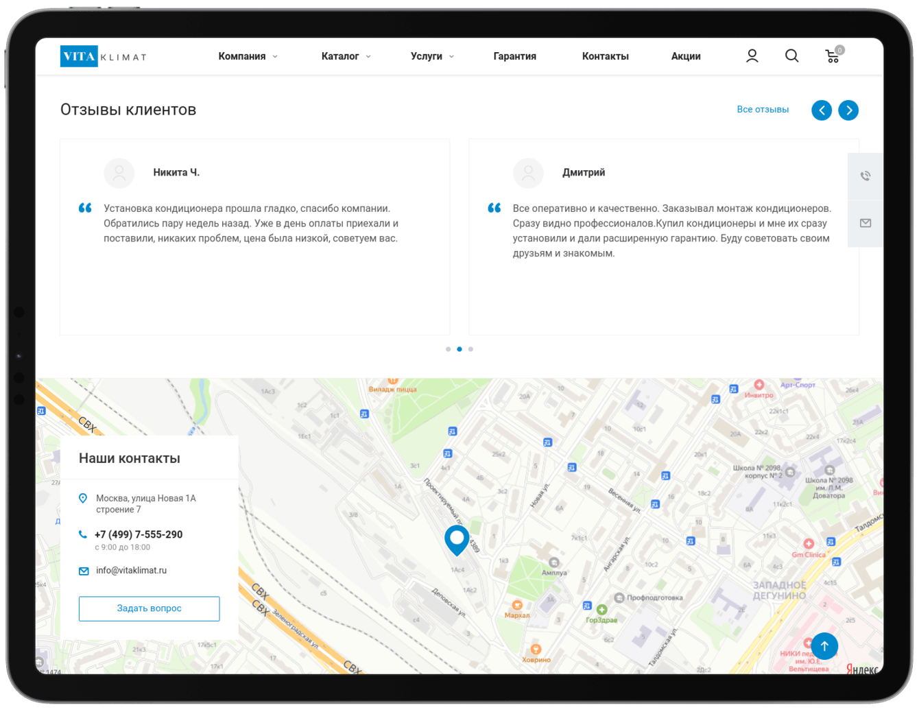Вывели на карте города точку самовывоза и офис компании, указав контактные данные для связи, такие как номер телефона и e-mail. Даже в этом блоке мы настроили форму обратной связи - это очень важно давать много способов связи клиенту сайта, чем их больше, тем больше вероятность оставления заявки, но главное не переборщить. :)После того как закончили с главной страницей мы перешли к настройке «шапки» и «подвала» сайта, разместили действительно нужны ссылки на страницы, на которых пользователь продукта сможет совершить конверсионные действия, заказать товар, услугу, либо напрямую обратиться в компанию, где пообщается с профессиональными продавцами климатической техники.Разработка логотипа компании была одной из задач и параллельно с разработкой сайта мы занимались его созданием. Была собрана информация о желаемой цветовой гамме, расположением элементов внутри логотипа и в конце работы мы показали 4 варианта логотипов на выбор, один из которых был одобрен со стороны заказчика. Логотип был разработан не только для сайта, но и для соц.сетей, визитных карточек, а также размещается на собственных автомобилях компании.