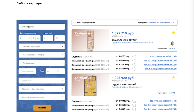 На странице результатов поиска пользователь имеет возможность возможность перейти в квартиры определенного типа выбранного жилого комплекса, добавить в избранное, отсортировать результаты поиска по параметрам: по цене и по дате добавления.
