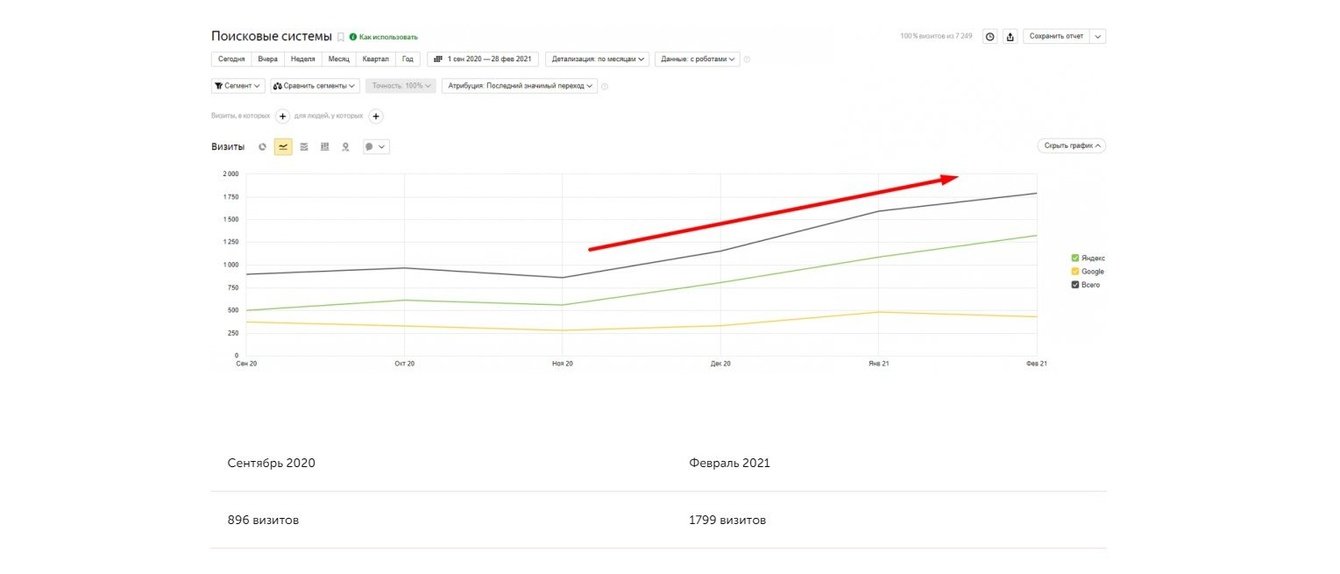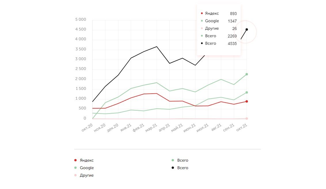 С октября 2020 по октябрь 2021 нам удалось увеличить поисковый трафик в 2,6 раз.