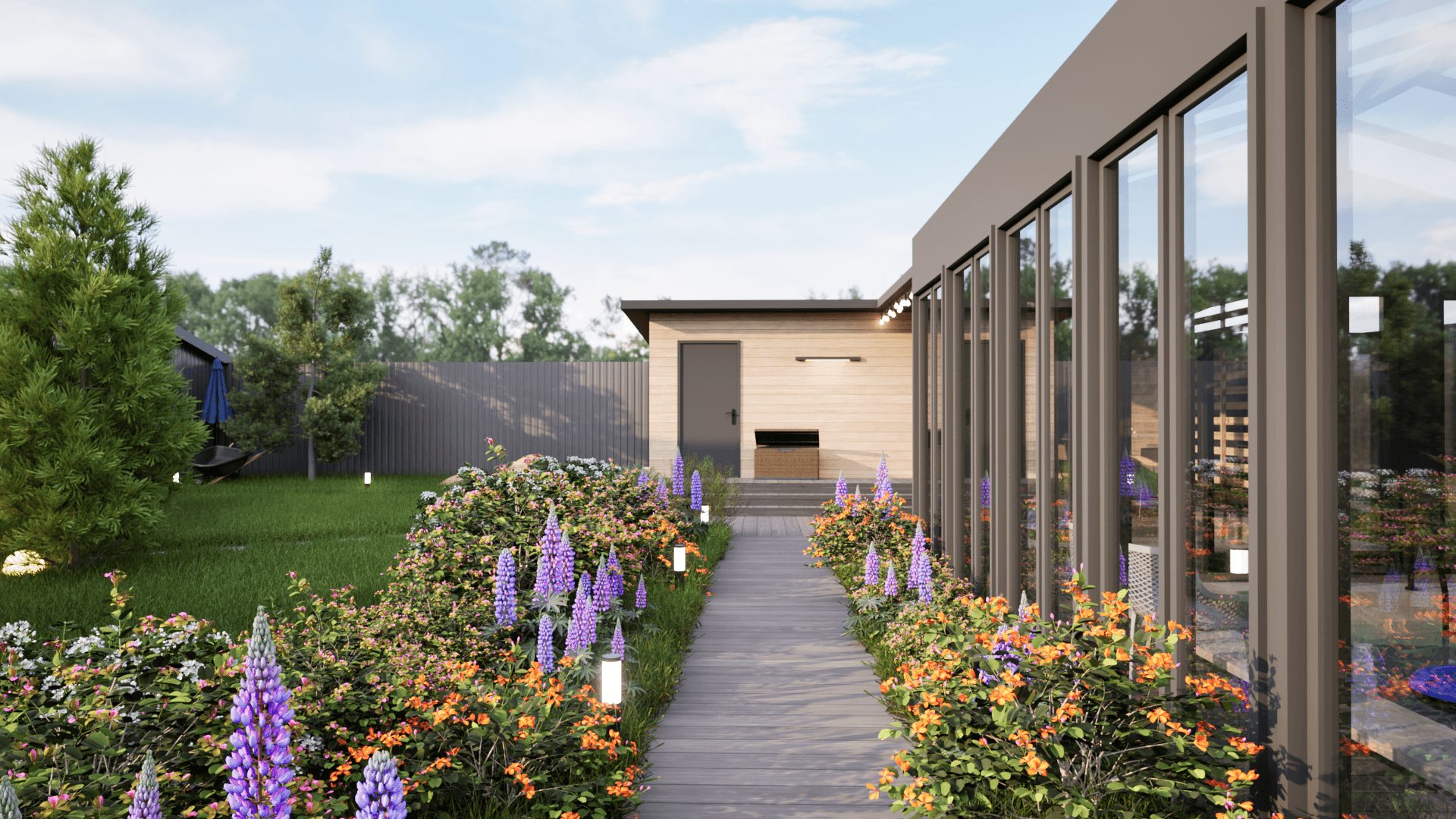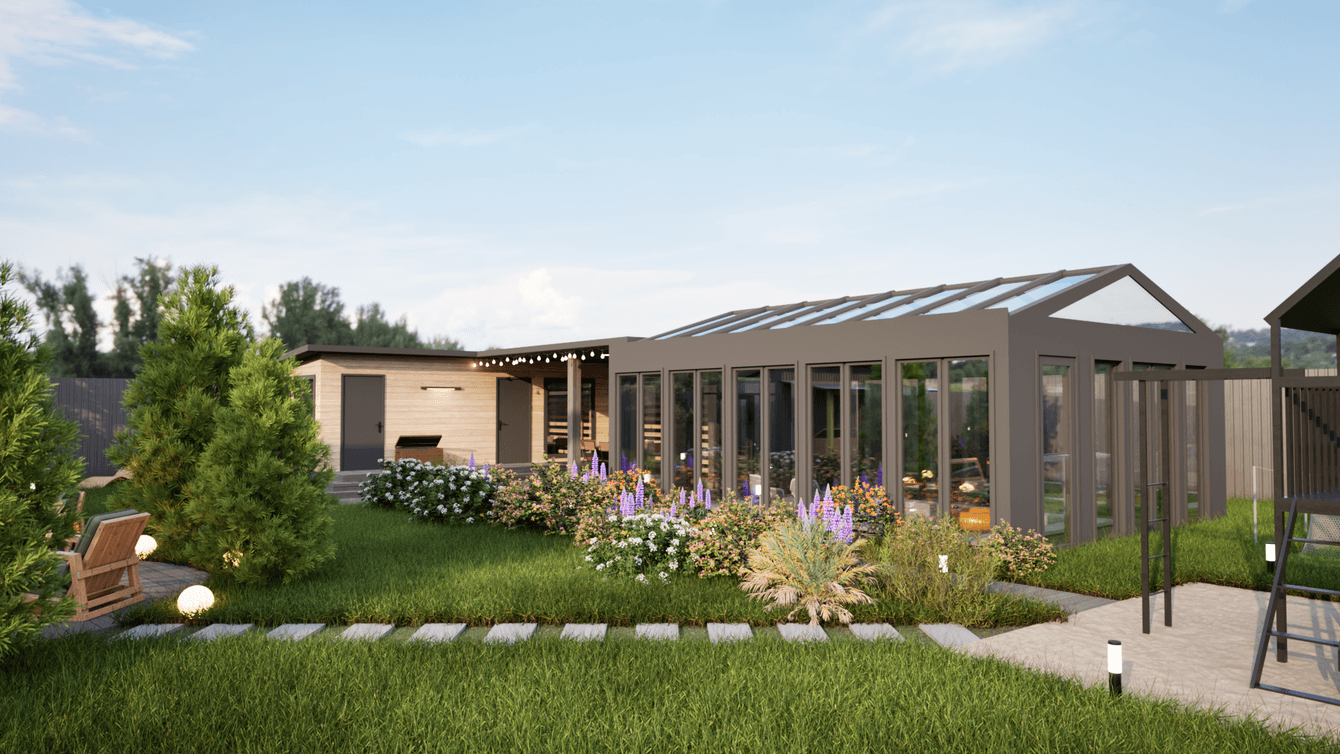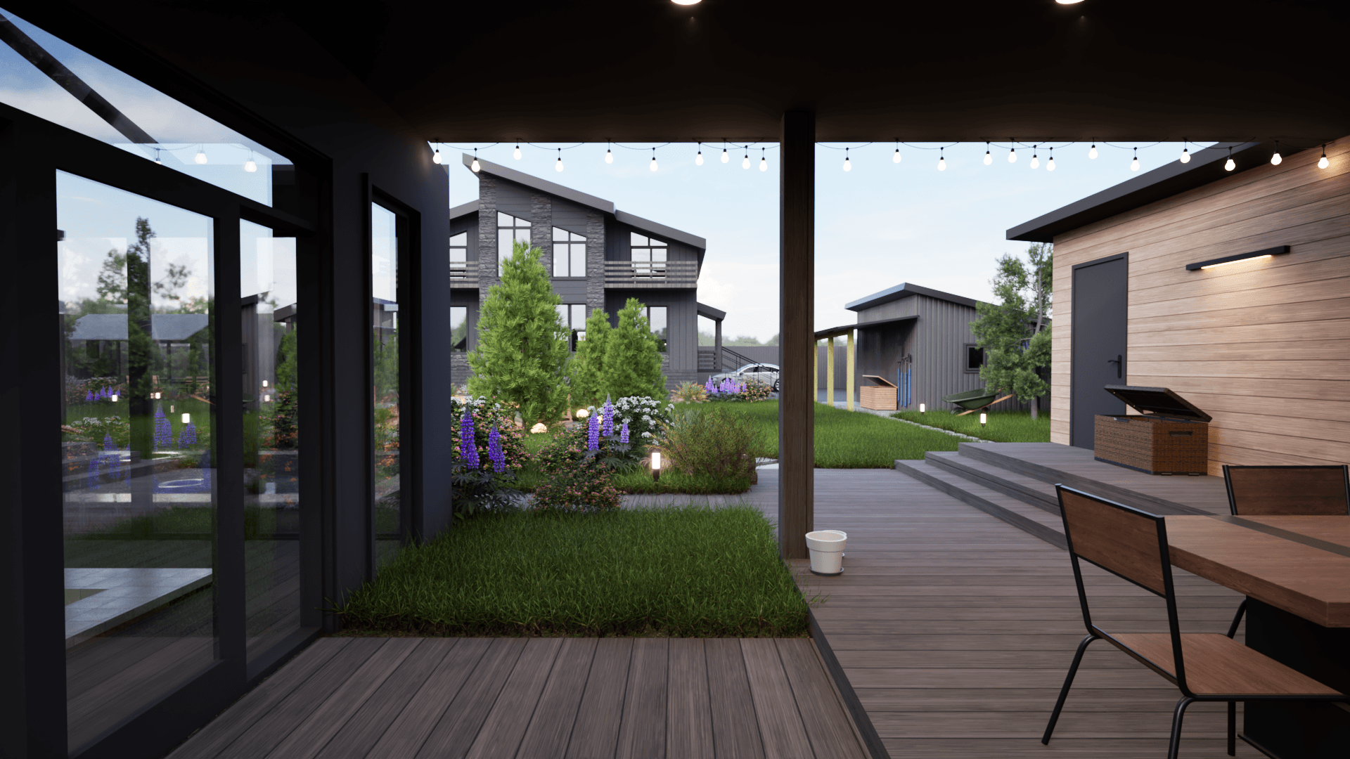 Визуализация выполнена с учетом временного отказа от бассейна, но с сохранением возможности его последующего внедрения без нарушения общей концепции. Все решения направлены на создание комфортной среды отдыха, где каждая зона функциональна и эстетически привлекательна.