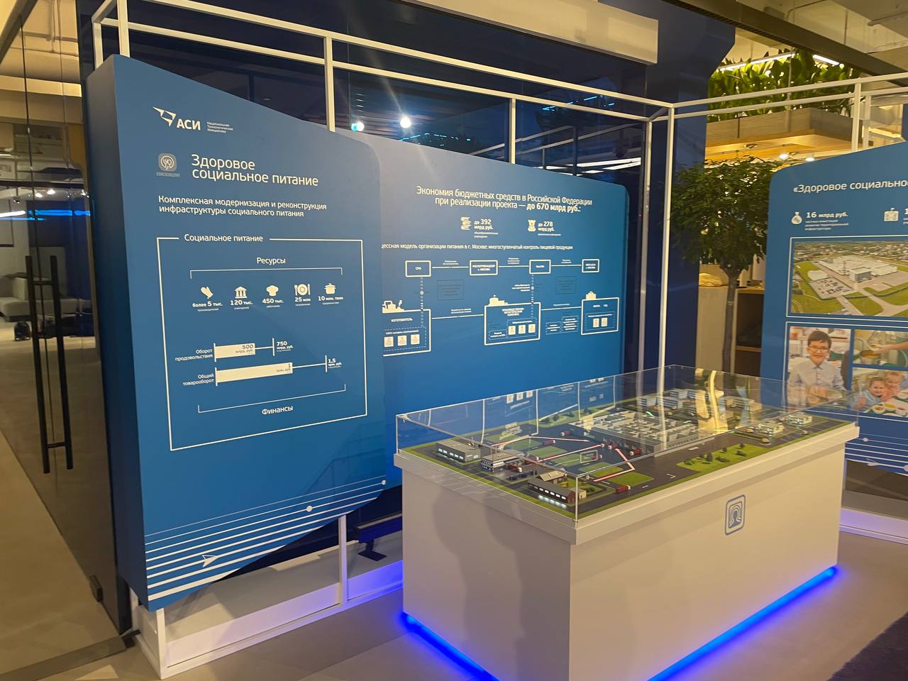 За 2 недели подготовить площадку к специальной выставке Агентства стратегических инициатив (АСИ), где в формате "7 станций" были представлены основные направления деятельности агентства на 2022-2024 годы, провести полную визуальную упаковку мероприятия: разработать общую стилистику, проработать более 25 стендов, создать инфографику для отраслей компании, презентации и интерактивные карты.