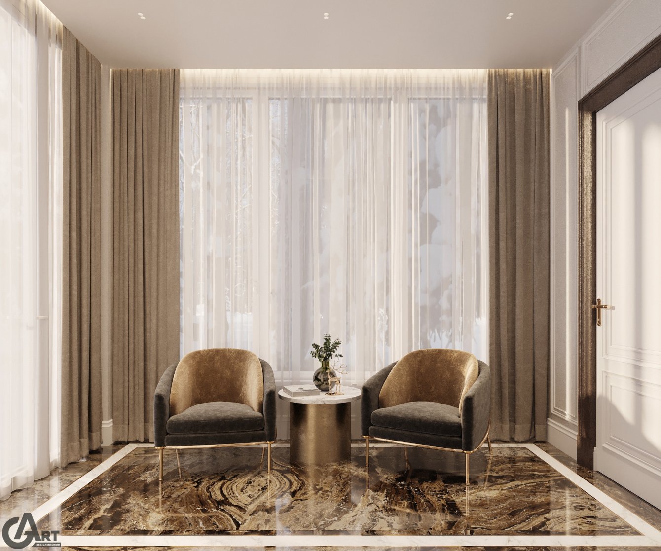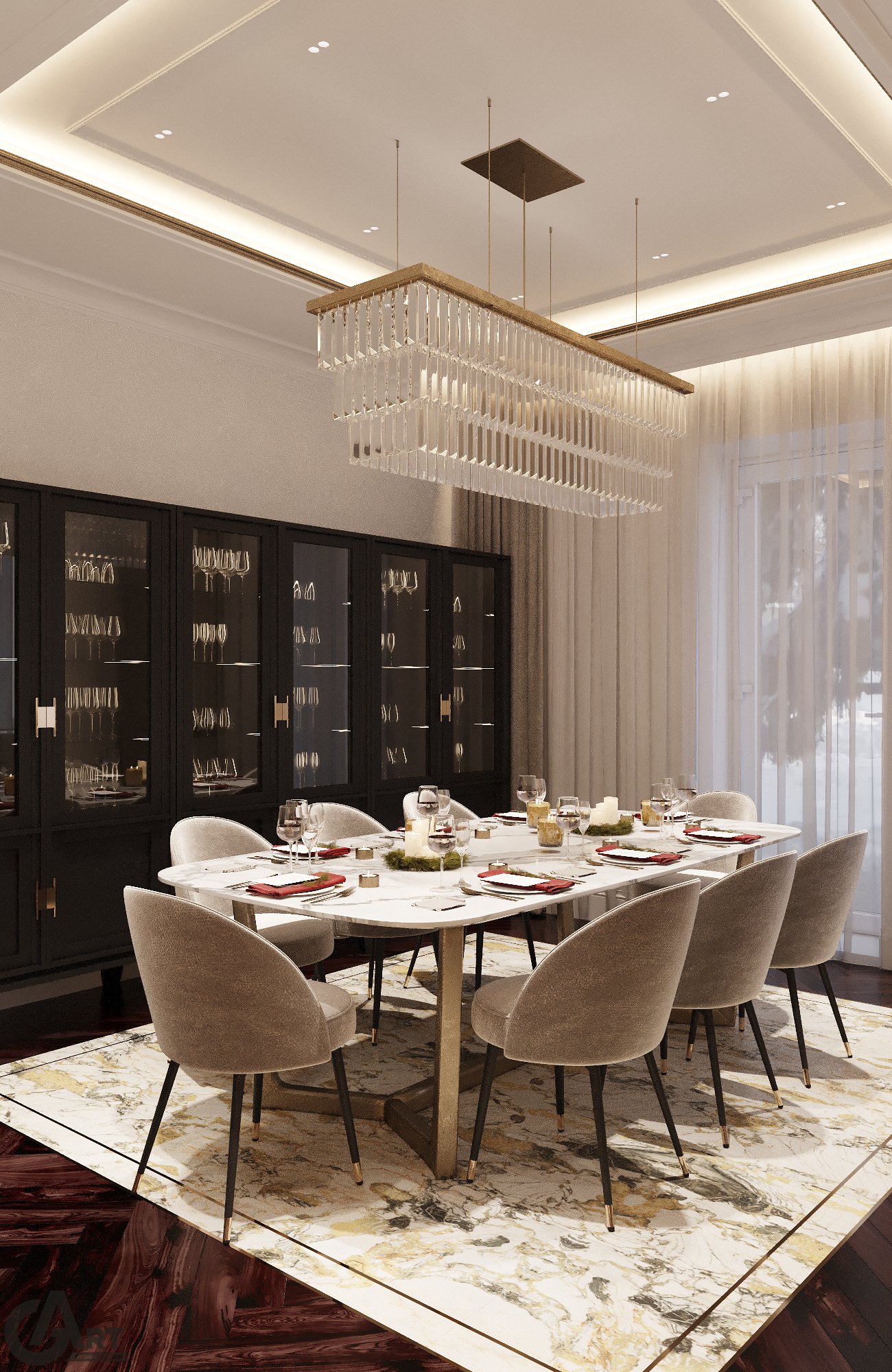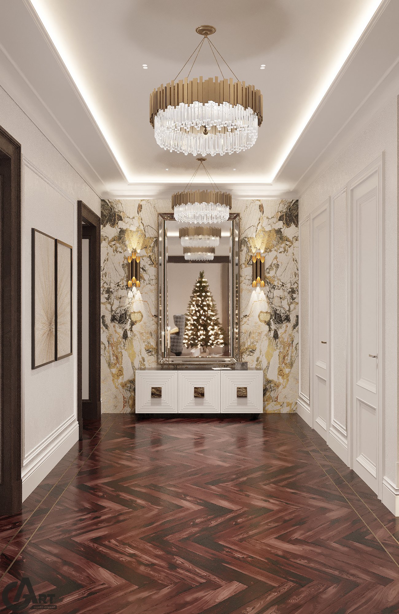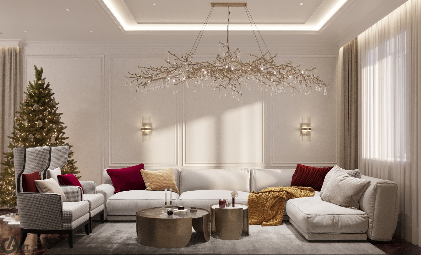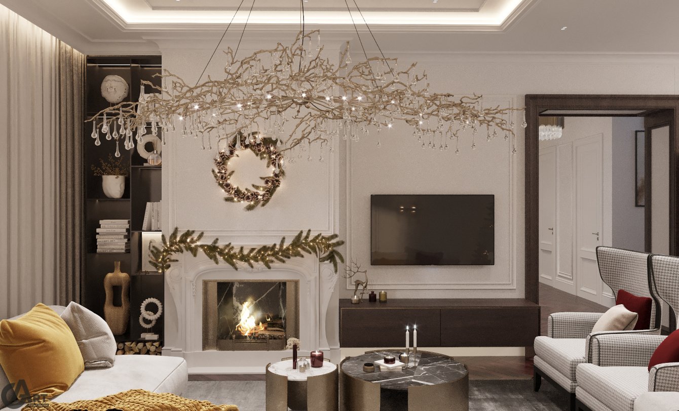Создать фотореалистичную 3D-визуализацию интерьера загородного дома в стиле французской неоклассики с элементами ар-деко.