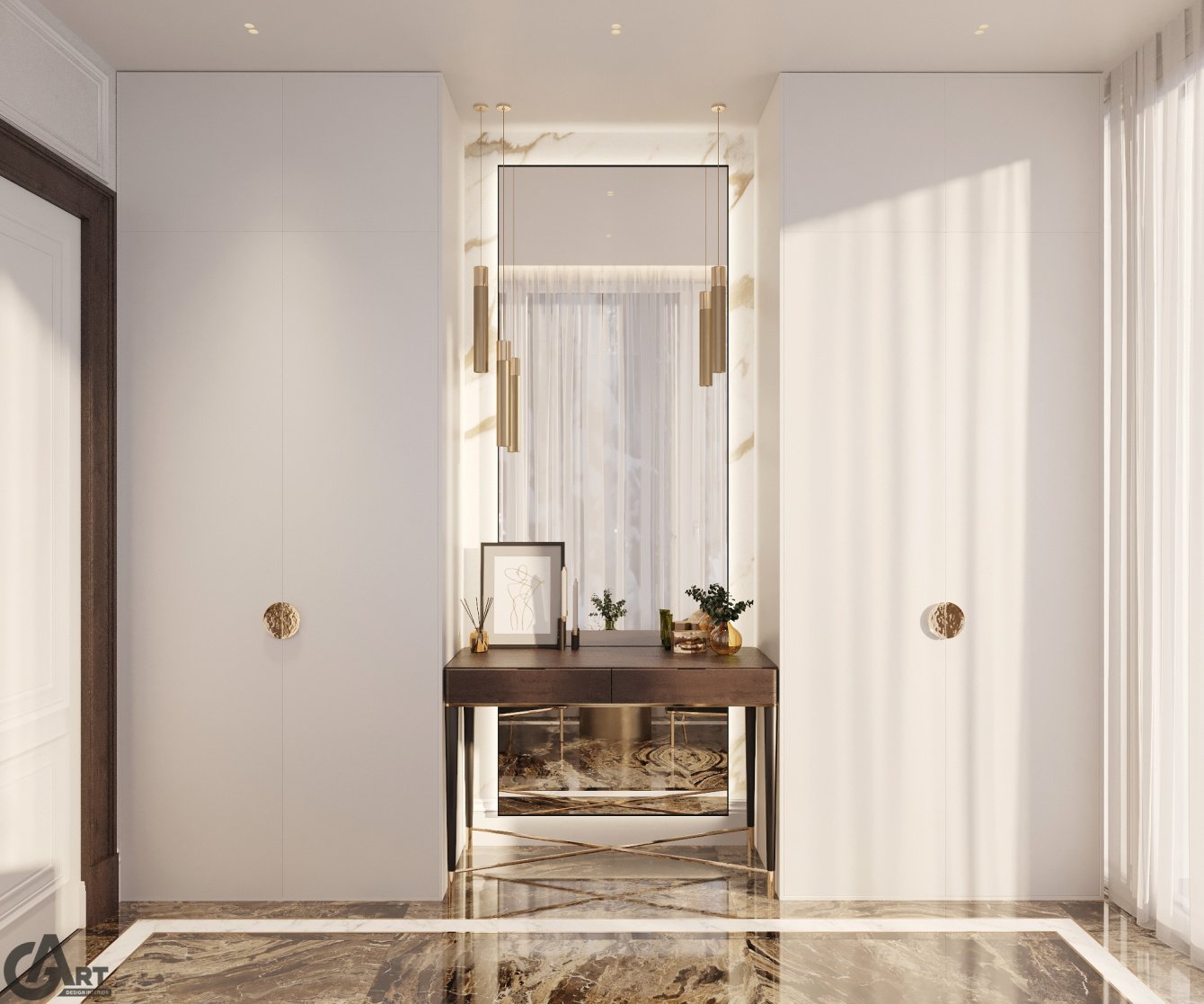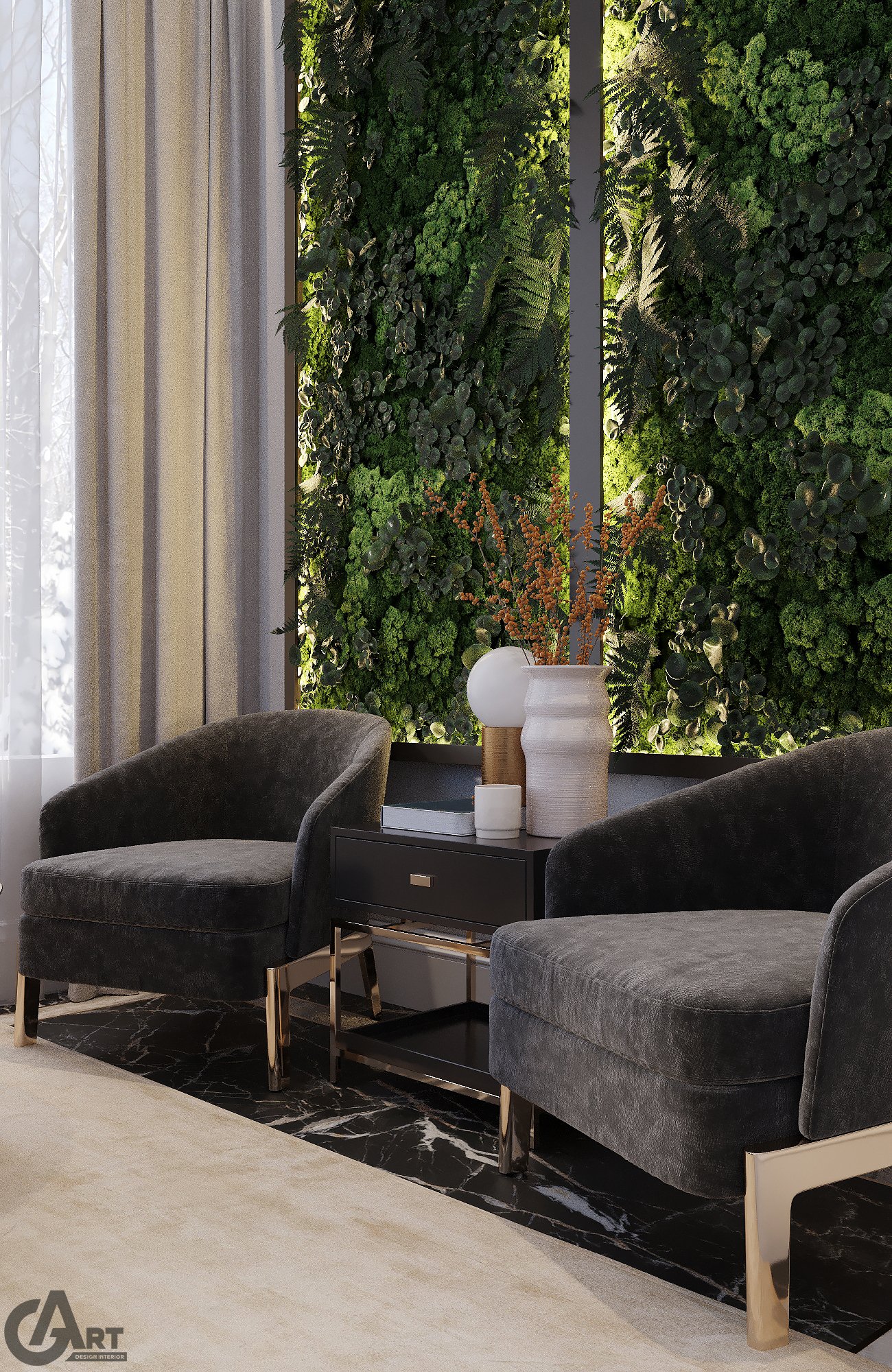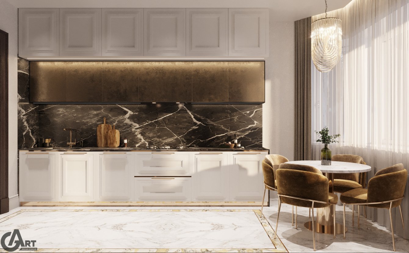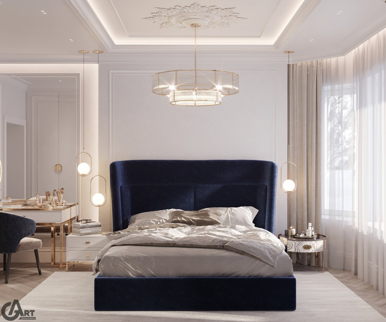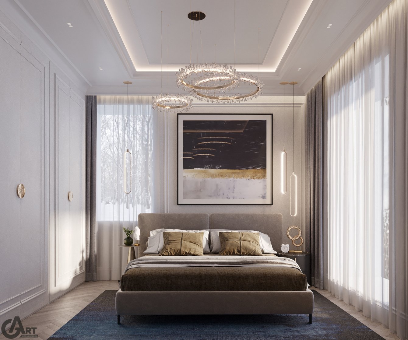 Создать фотореалистичную 3D-визуализацию интерьера загородного дома в стиле французской неоклассики с элементами ар-деко.