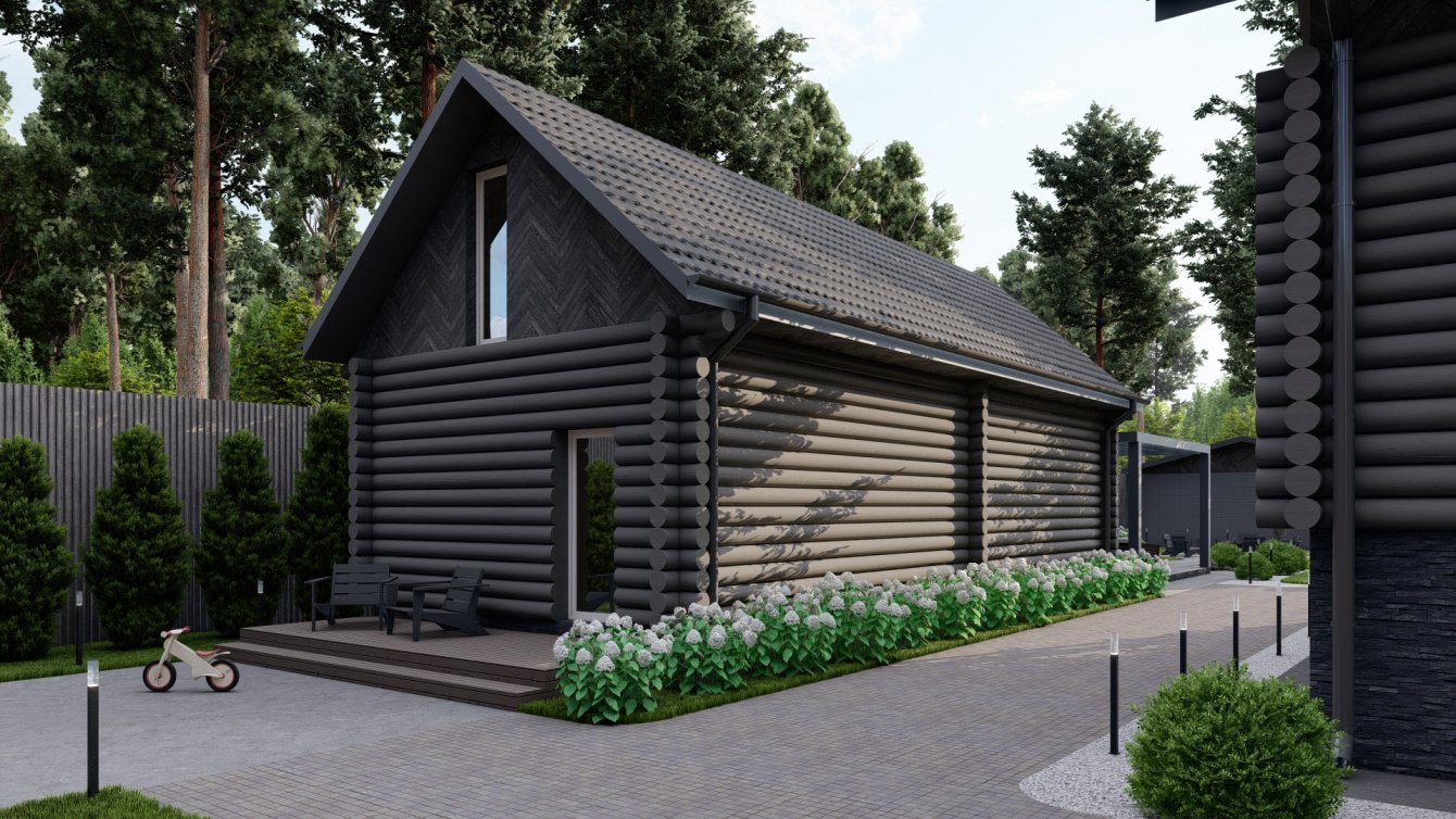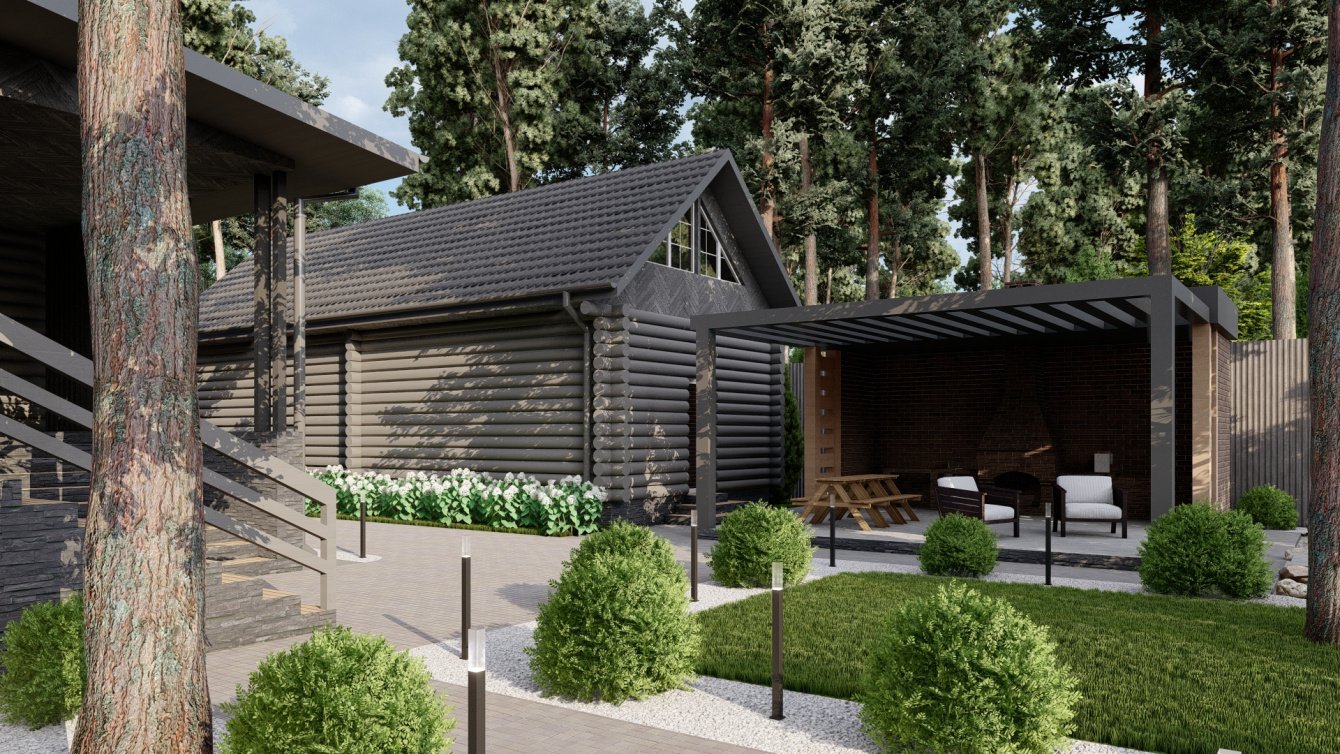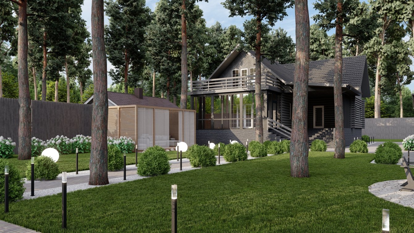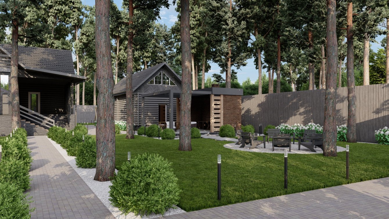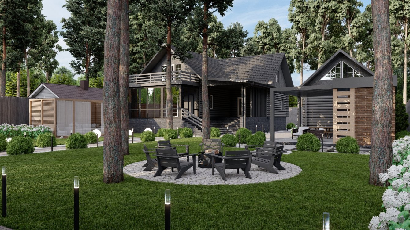 Требовалось разработать ландшафт участка с домом и прилегающими МАФами по референсам.