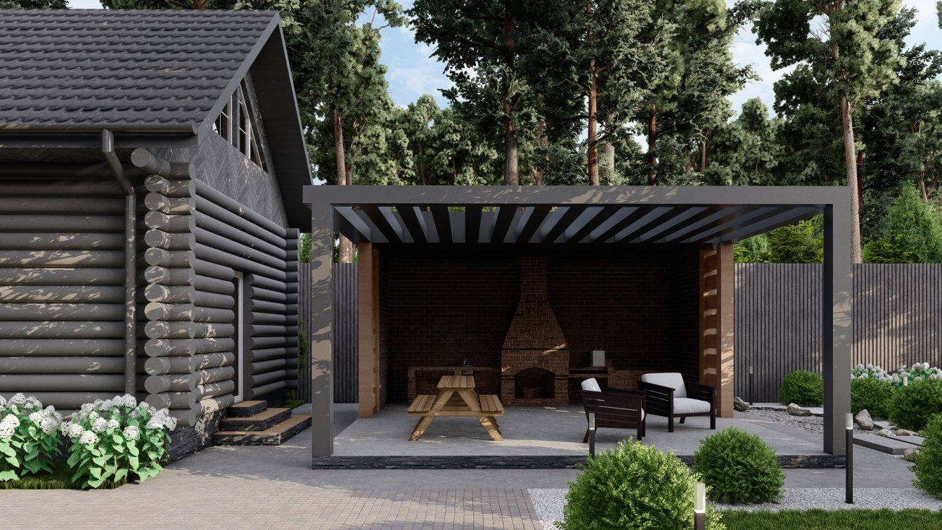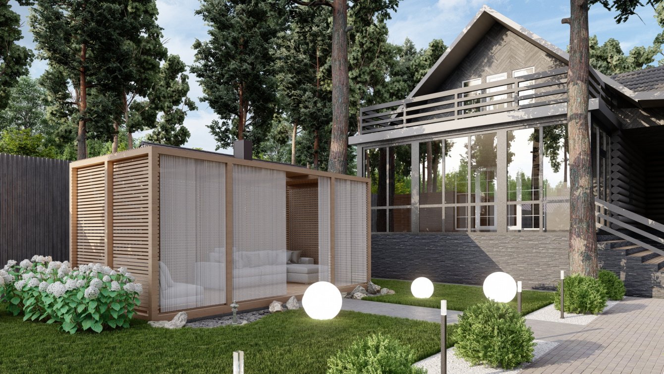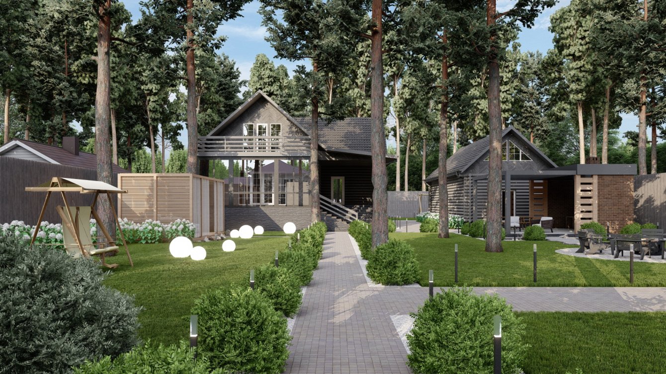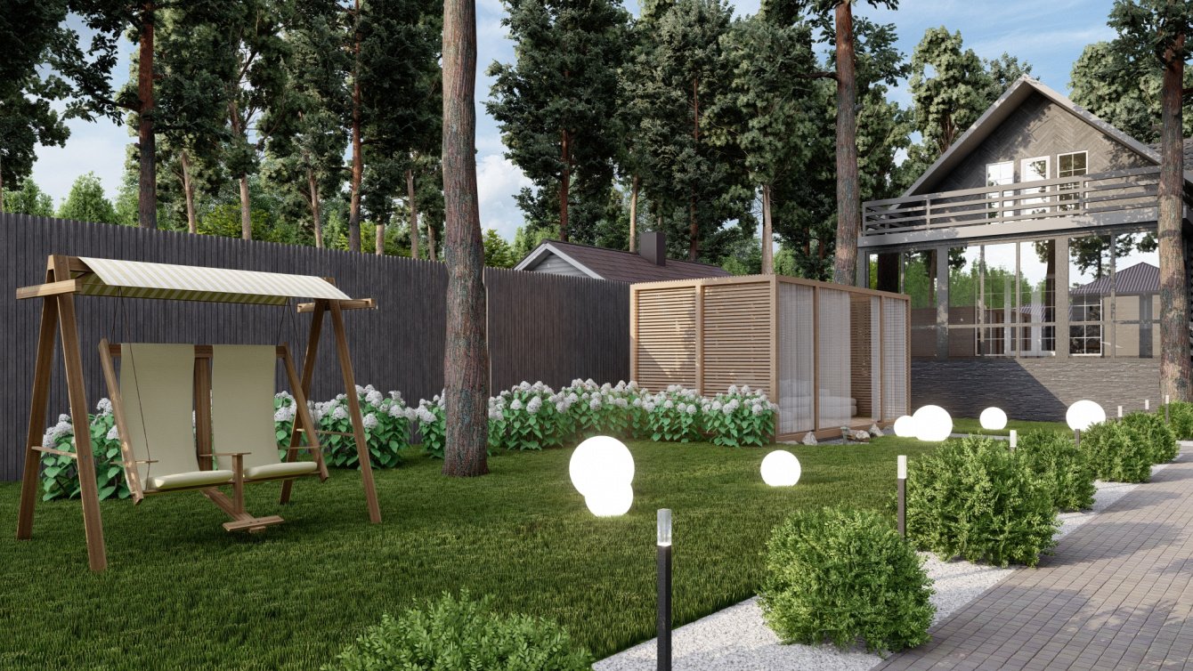 МАФы, такие как беседки, качели и скамейки, были размещены так, чтобы они интегрировались в общую композицию. Я прописал их стилистику, исходя из выбранного направления дизайна от клиента. Также предусмотрел освещение для создания вечерней атмосферы.