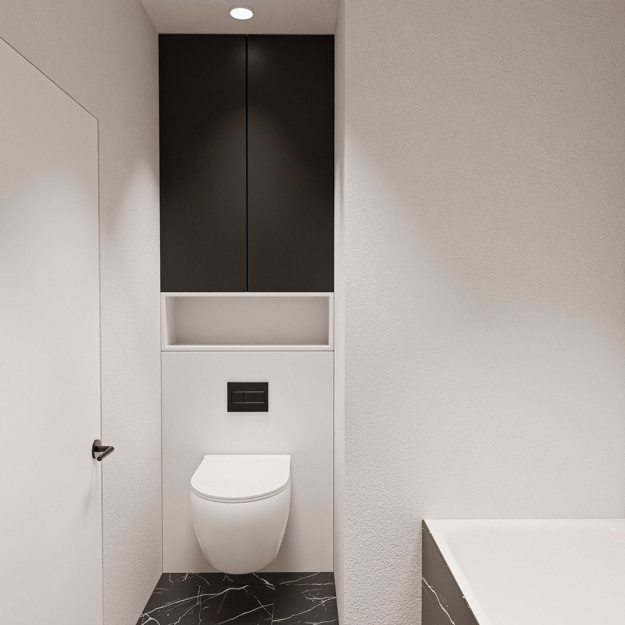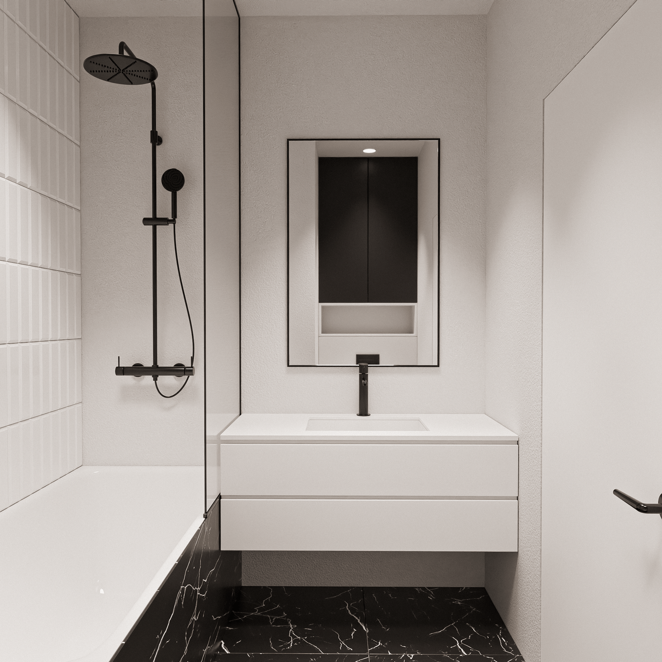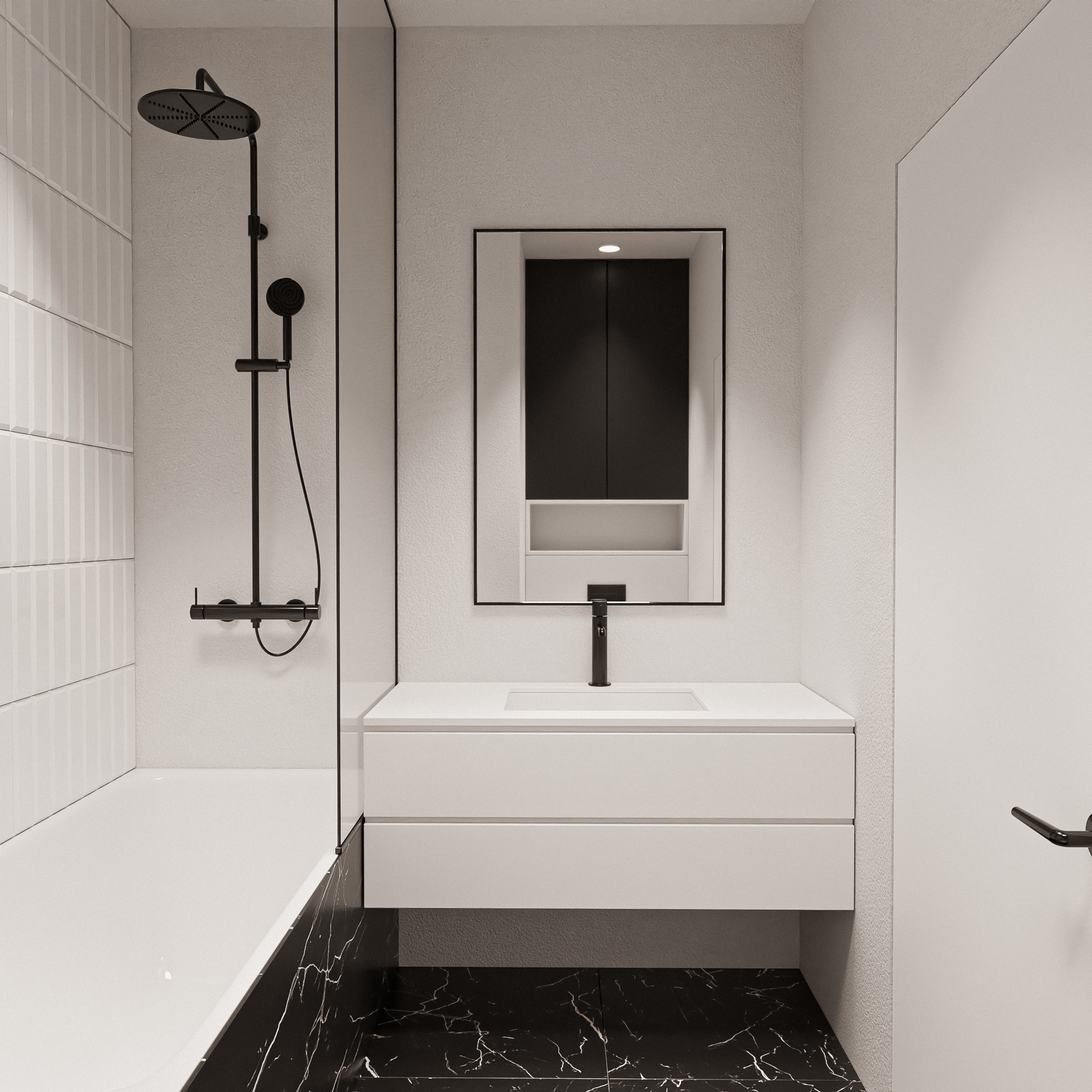 Проработал каждую деталь: от точной расстановки сантехники и мебели до подбора материалов для плитки, текстур и сценария освещения.