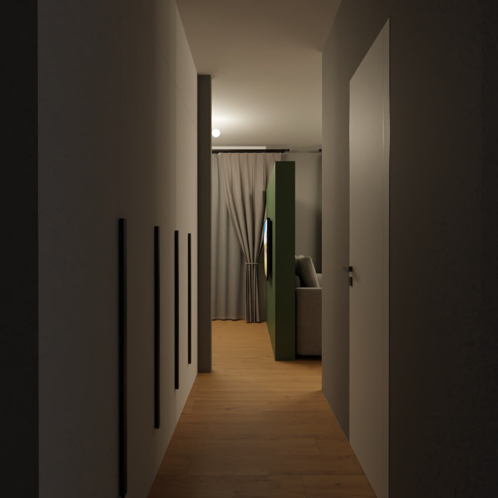 По стенам, реализовали сочетания светло-/темно- серых тонов в зале. Заказчик прислал обои, которые хотел видеть в визуализации. Относительно этого - предложили решение по квартире и уже согласовали финальные рендеры.