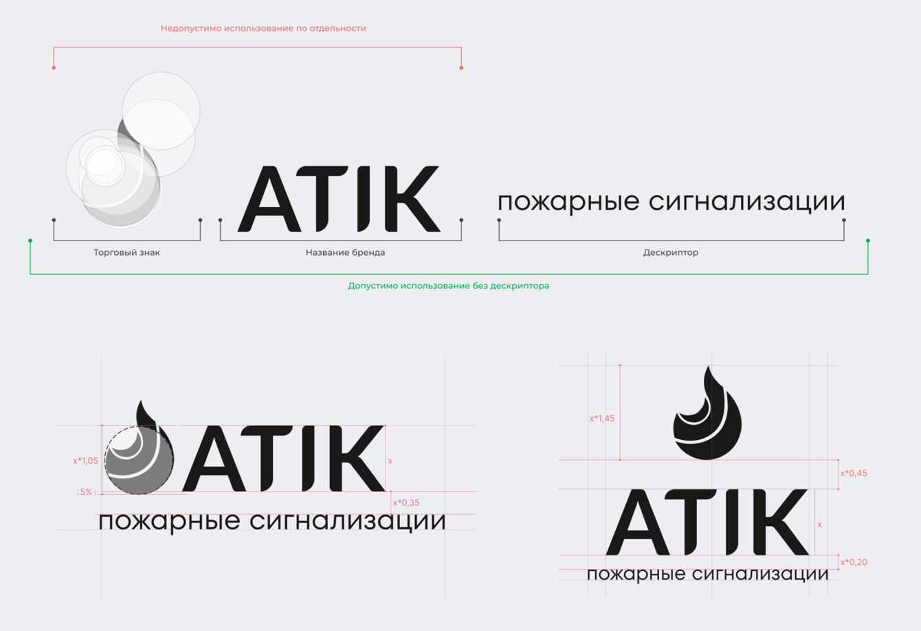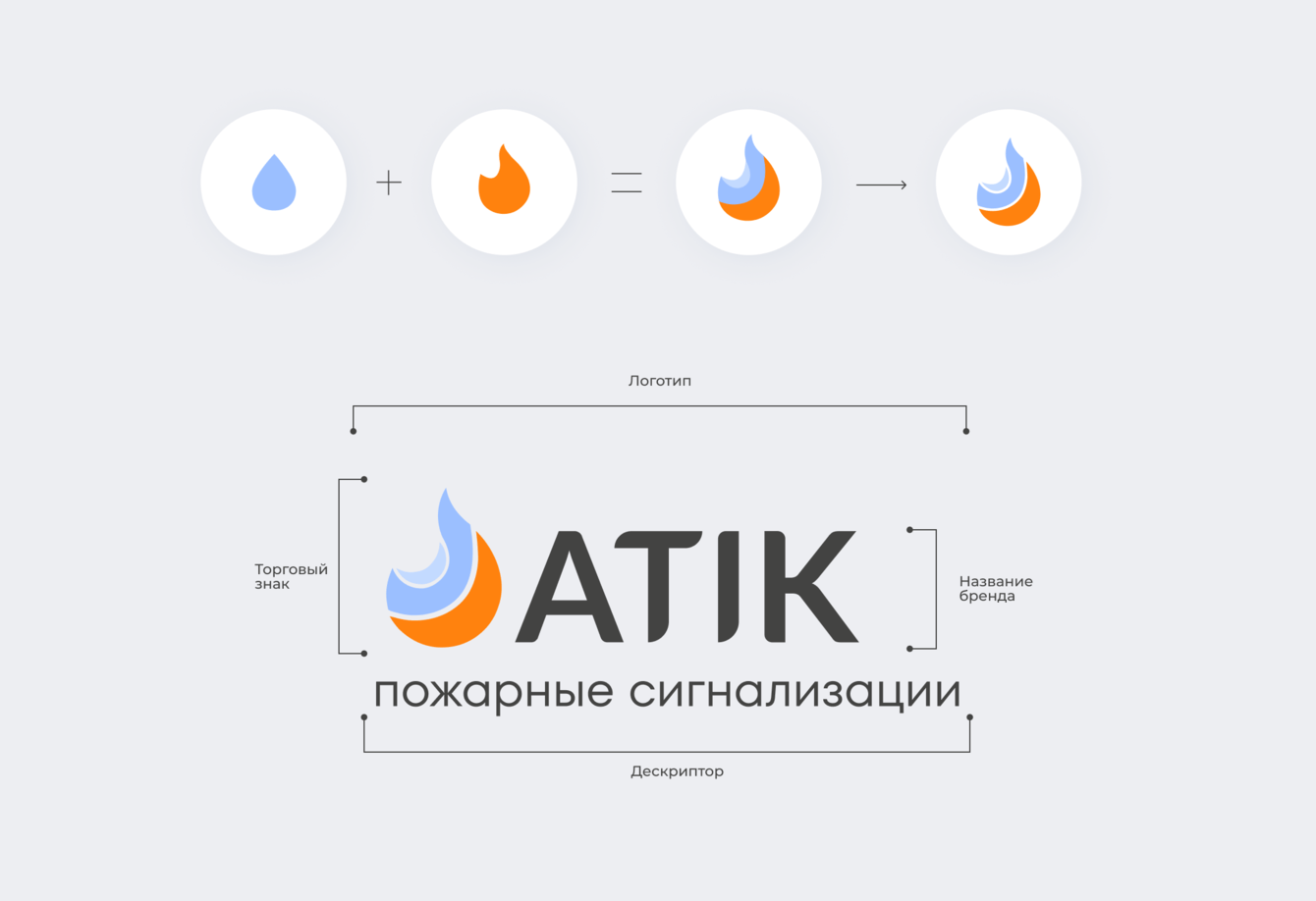 В основе концепции логотипа лежит простая и в то же время сильная визуальная метафора: капля воды тушит пламя. Образ напрямую отражает основную функцию продукции — обнаружение и предотвращение возгораний.