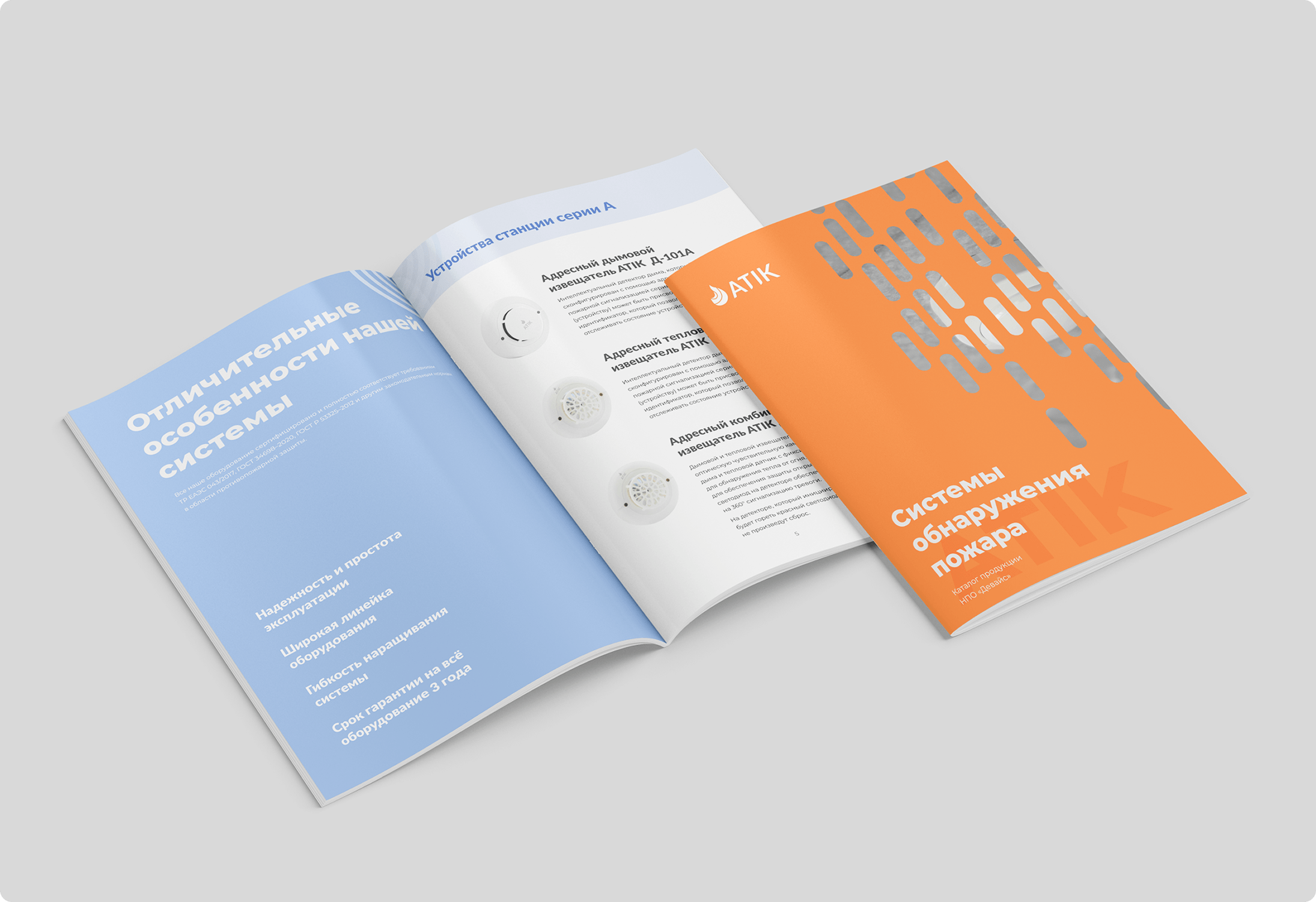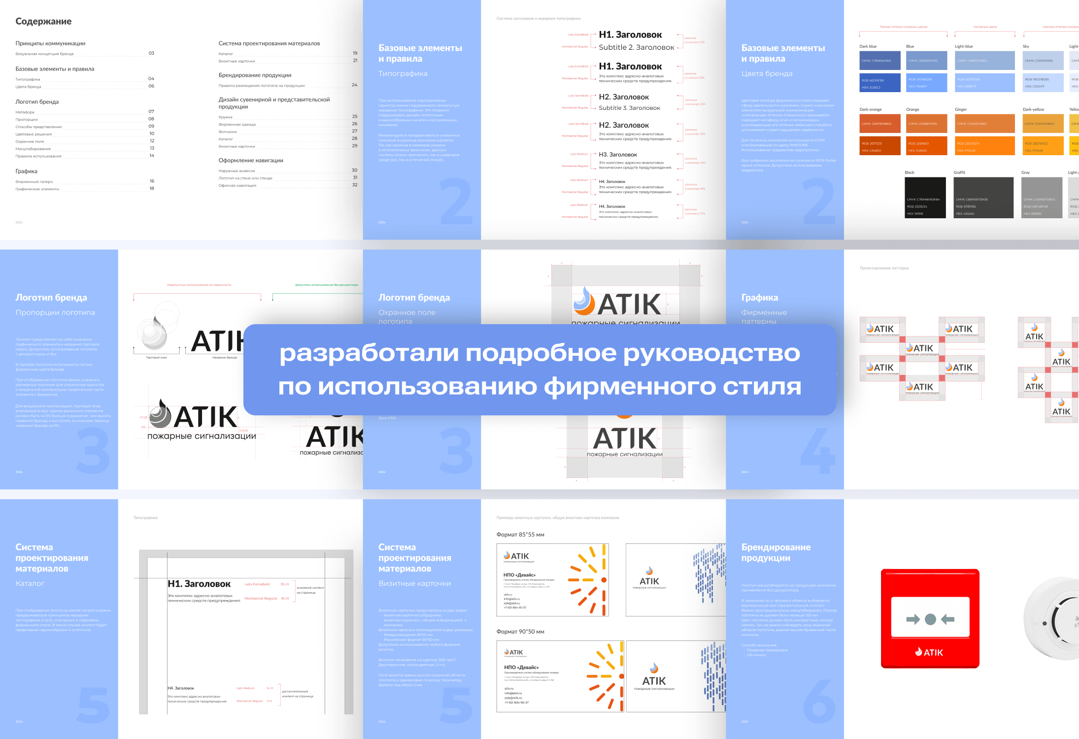 Цветовая палитра фирменного стиля построена на контрасте и дополняющих друг друга значениях. в основе «сигнальные» оттенки пламенного оранжевого — метафорически они связаны с огнем и функциями сигнализации. Им противопоставлены охлаждающие небесно-голубые — они про ощущение контроля и связь с водой.