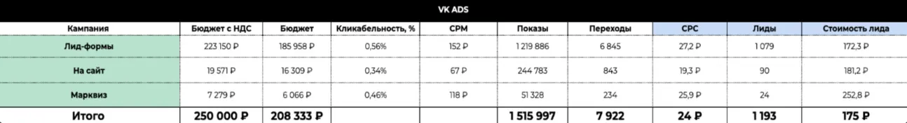 Результаты до. В прошлом году другой подрядчик запустил кампанию в старом рекламном кабинете VK. Объявления вели аудиторию сразу на сайт. Клиент получил 278 заявок по 478 рублей. Показатели не устраивали, их хотелось улучшить.