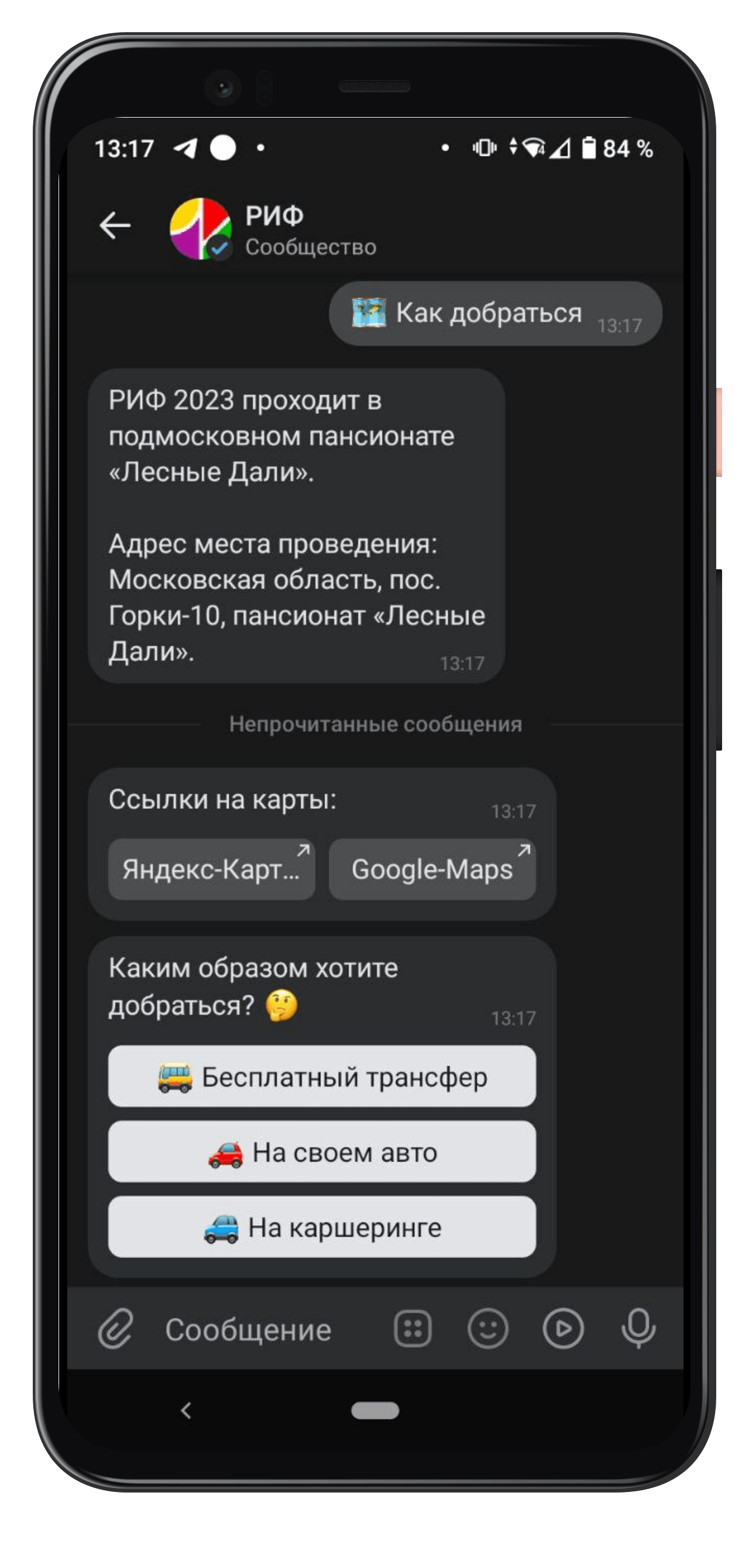 Например, если вы ищете информацию о том, как добраться на форум, достаточно выбрать кнопку меню в VK-боте «Как добраться». В ответ бот выдаст список вариантов — бесплатный трансфер, на своем авто, на каршеринге. Кроме того, бот может подсказать, какие станции метро или остановки общественного транспорта следует выбрать.