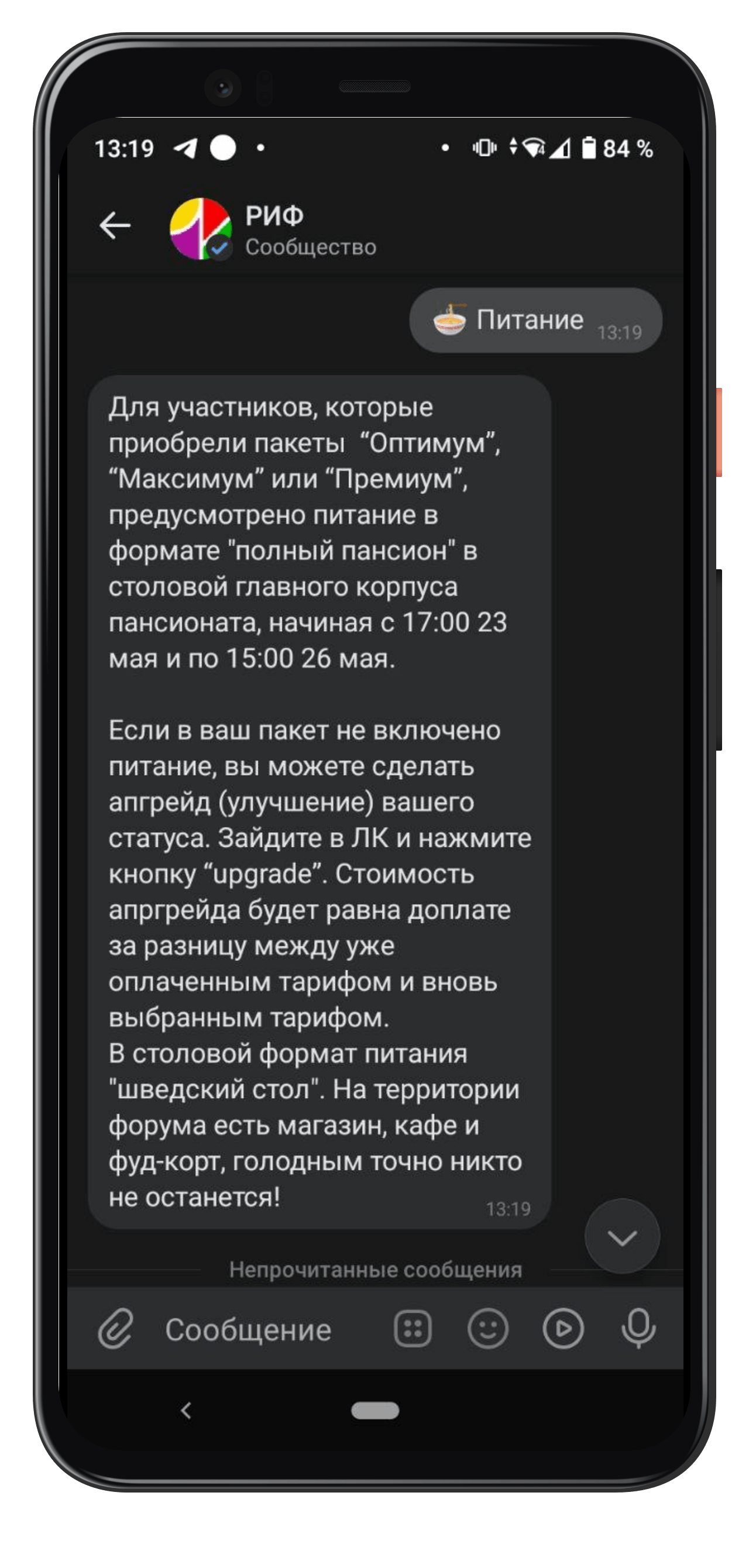Если вам интересно быстро узнать о разнообразных возможностях питания на форуме, то VK-бот с легкостью ответит на ваш вопрос. Просто нажмите кнопку «Питание» в меню клавиатуры. Бот подскажет расписание точек питания и покажет меню столовой, на территории форума.