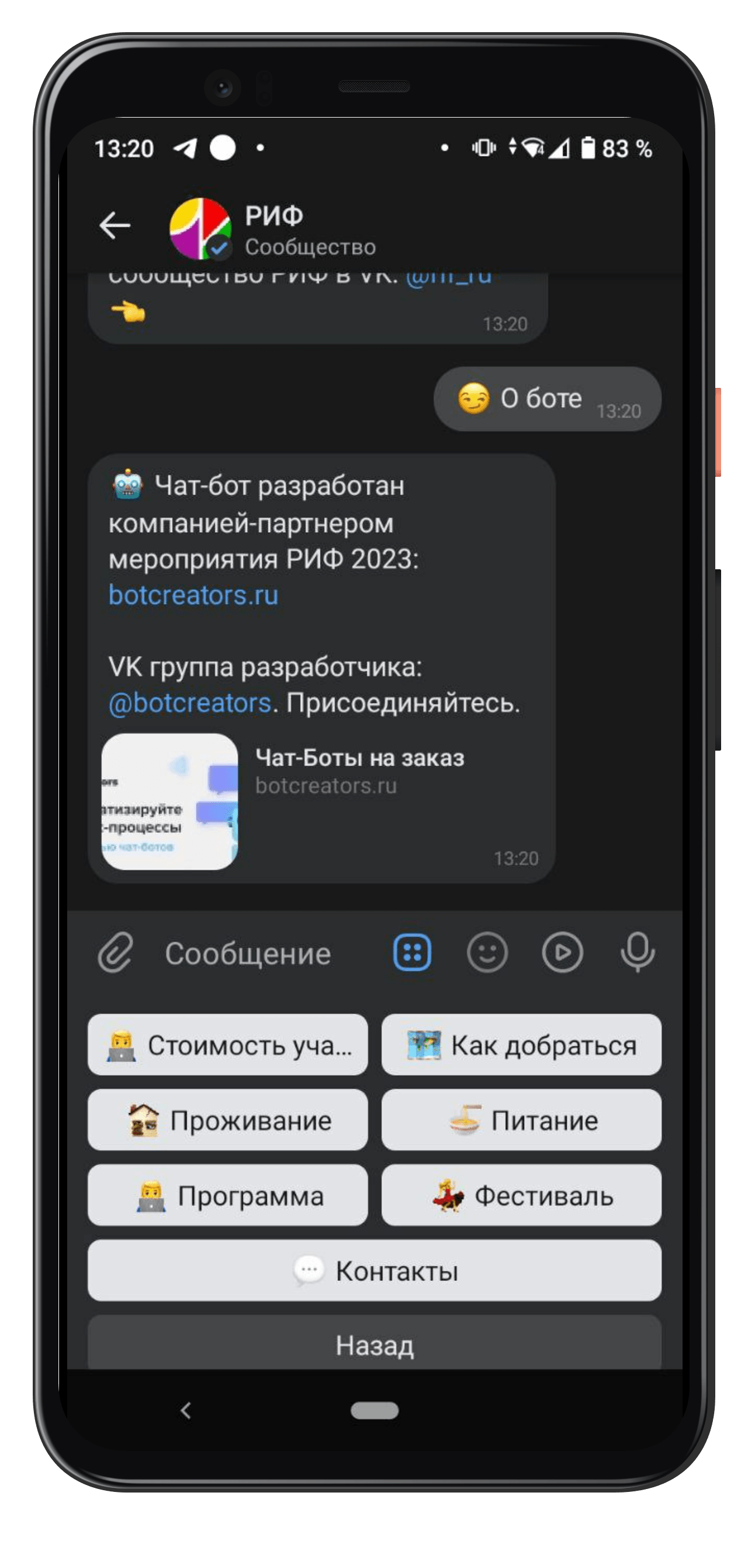 Российский интернет форум — это всегда огромное количество людей, мероприятий и активностей, чтобы не потеряться в этой лавине информации, необходим помощник. Помощник, который все дни форума будет под рукой. В партнерстве с организаторами форума мы разработали VK-бота, который помогал пользователям получать информацию о мероприятиях РИФ 2023 и ориентироваться на территории форума.