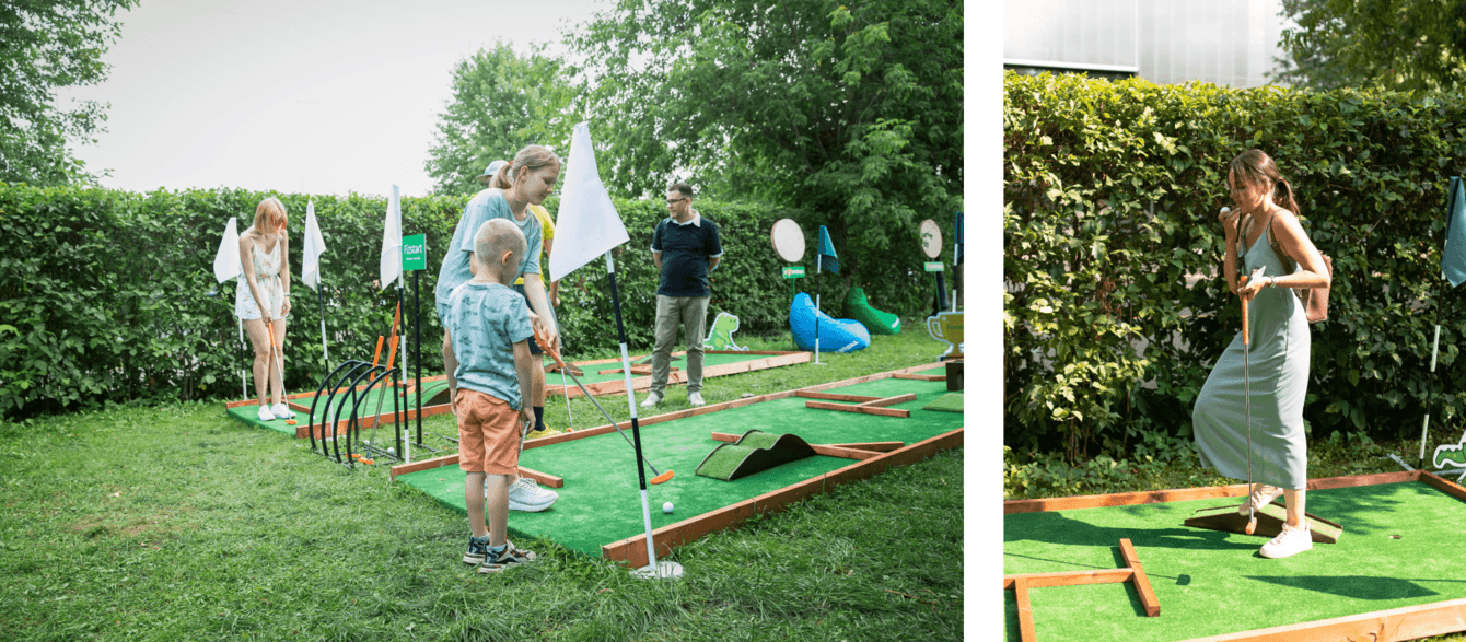 Рядом стояли две дорожки для мини-гольфа. Участники соревновались, кто быстрее загонит шар в лунку. Победитель получал фирменный мерч.