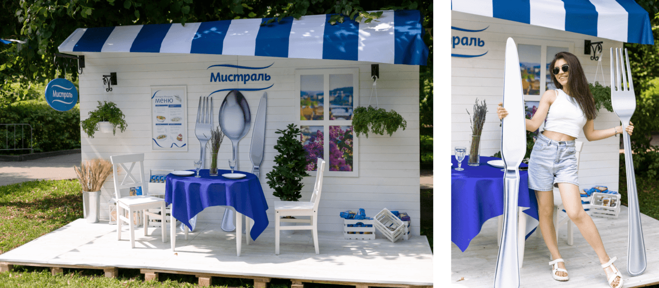 на которой мы создали атмосферу летней веранды в любимом кафе. Дополнительно сделали гигантские столовые приборы, чтобы их можно было использовать как реквизит для съёмки.