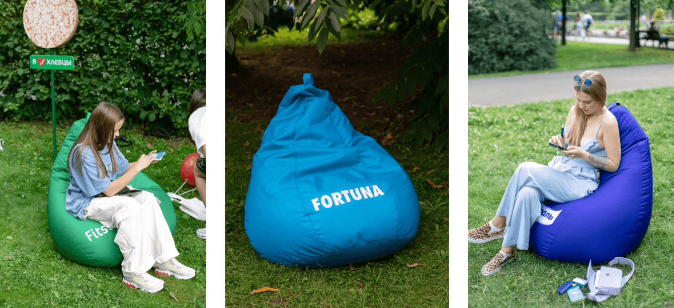 Зона отдыха — общая зона всех брендов с креслами-пуфами и хлебцами на палочке, с которыми можно было фотографироваться. Поскольку наша территория была на газоне и вокруг были деревья, зона отдыха оказалась в тени в жаркие июльские дни. Так что почти всегда кресла были заняты.