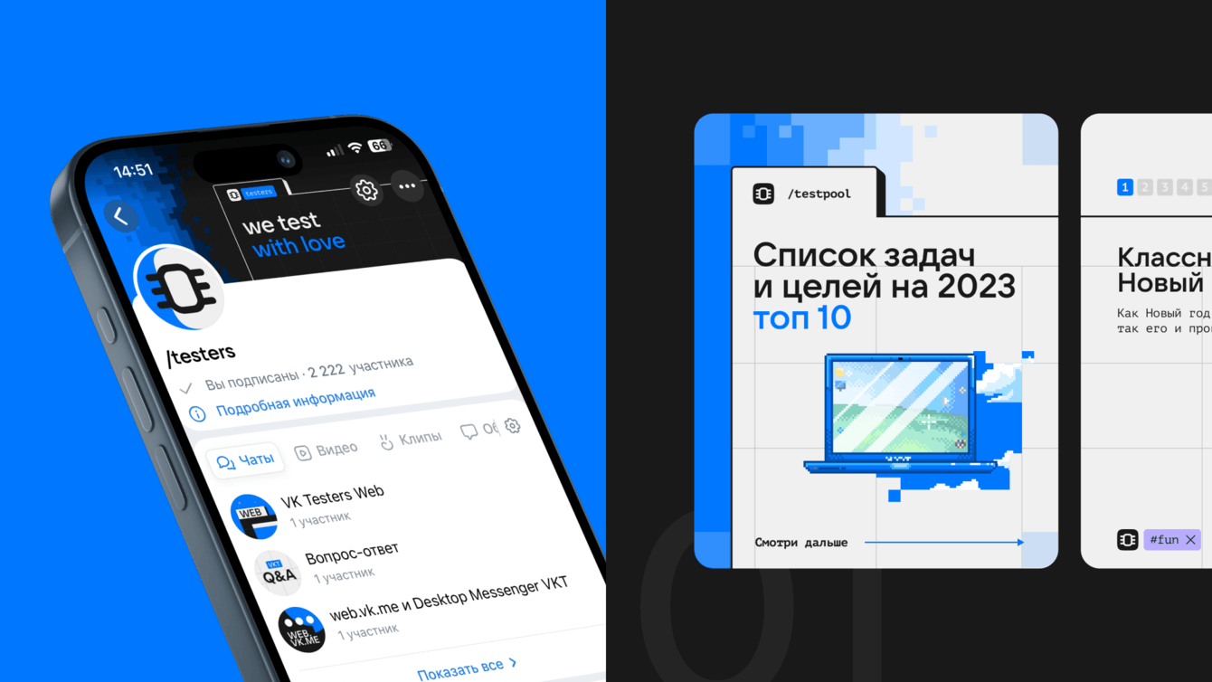 Данный проект стал для нас успешным опытом создания дизайн-решений для специфичной аудитории с необычным и разнообразным бэкграундом. Разработанная нами система айдентики для различных платформ включает в себя концепцию мерча и инструменты, например, конструктор иллюстраций, который облегчает создание и использование фирменного стиля. Вместе с логотипом айдентика для VK Testers: цветовая палитра, шрифты и визуальный стиль — придаёт выразительности продукту и подчеркивает его современный образ. А финал проекта в виде интерактивного гайдлайна помогает удобно внедрять разработанные дизайн-элементы.