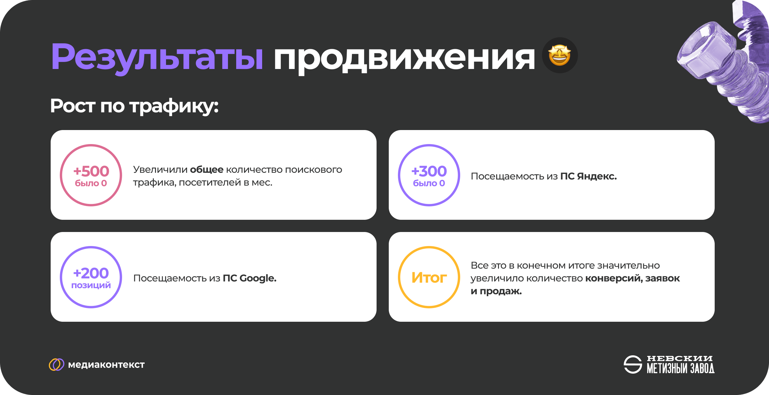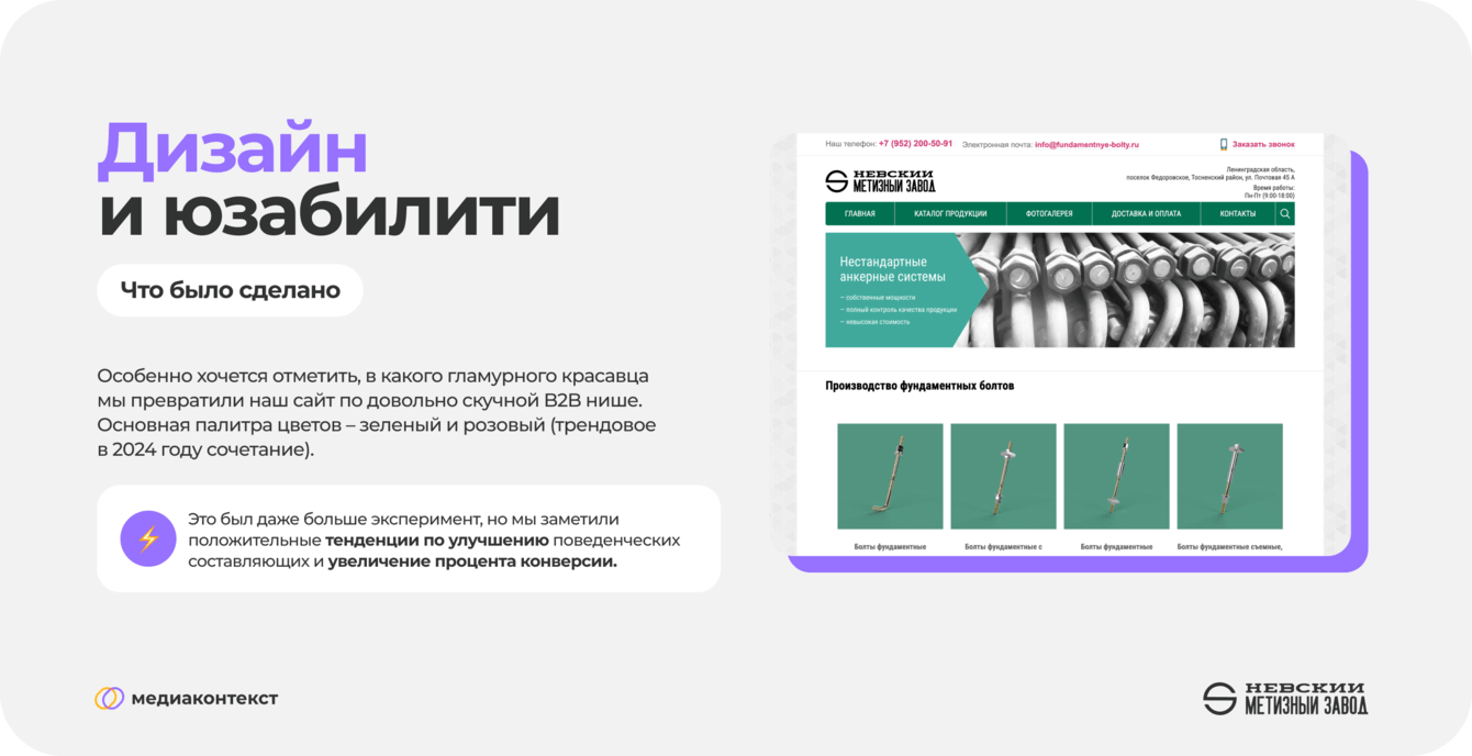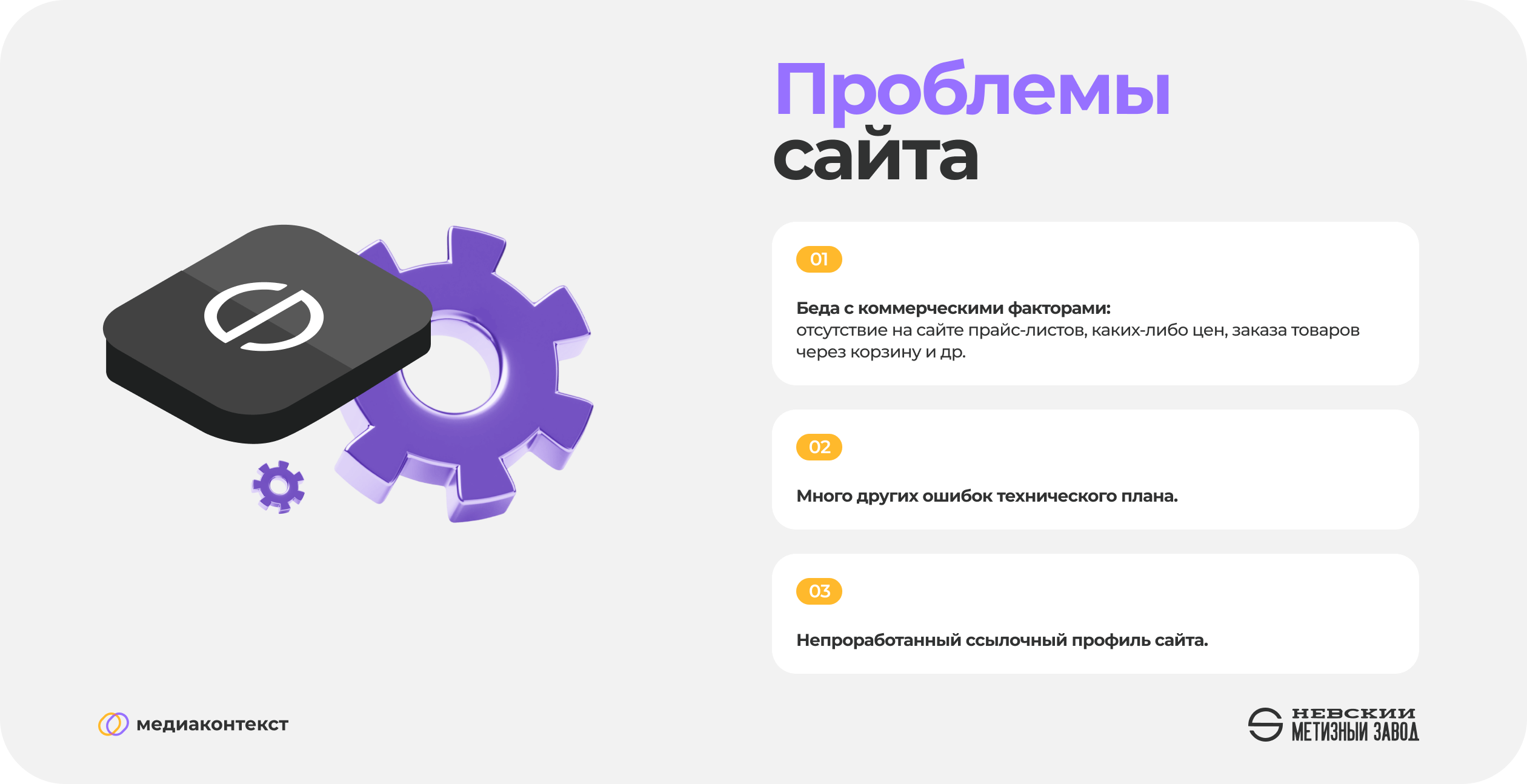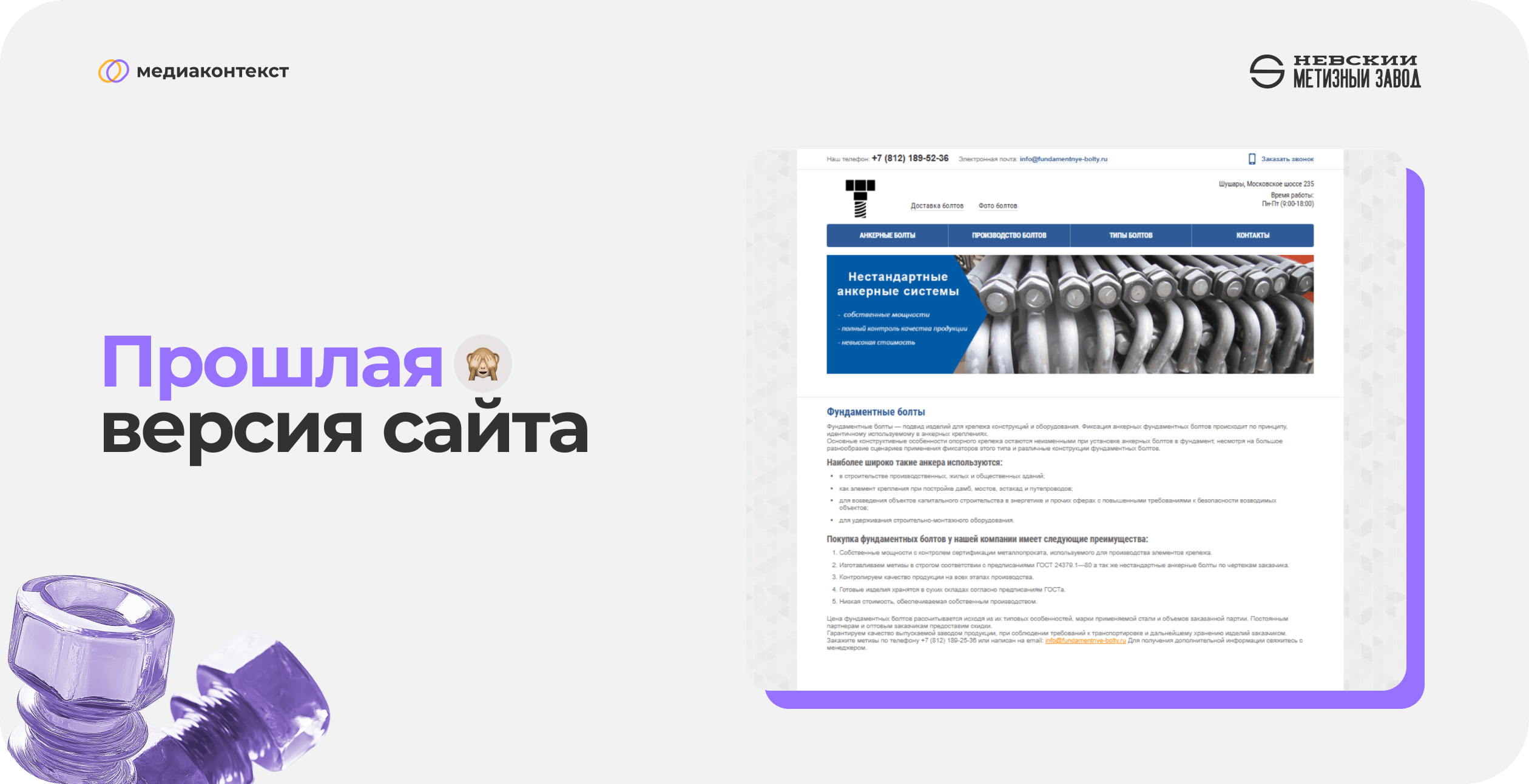Мы получили в продвижение уже довольно немолодой сайт производства фундаментных болтов, который был сделан в стилистике 90-х годов с устаревшими приемами дизайна, устаревшей версией CMS, отсутствием мобильной версии, множеством ошибок технического и коммерческого плана.