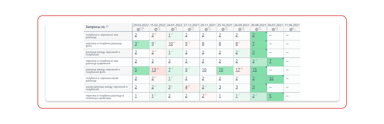 Однако отчёт по позициям показывает, что доля запросов в топ — 5 стабильна от месяца к месяцу или растёт.