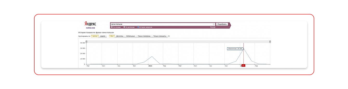 Отчёт «Яндекс.Вордстата» по сезонности запроса «личи польза». На графике видны ярко выраженные пики спроса в январе. Мы заранее написали статью про пользу фрукта, и в январе она принесла максимальное количество визитов.