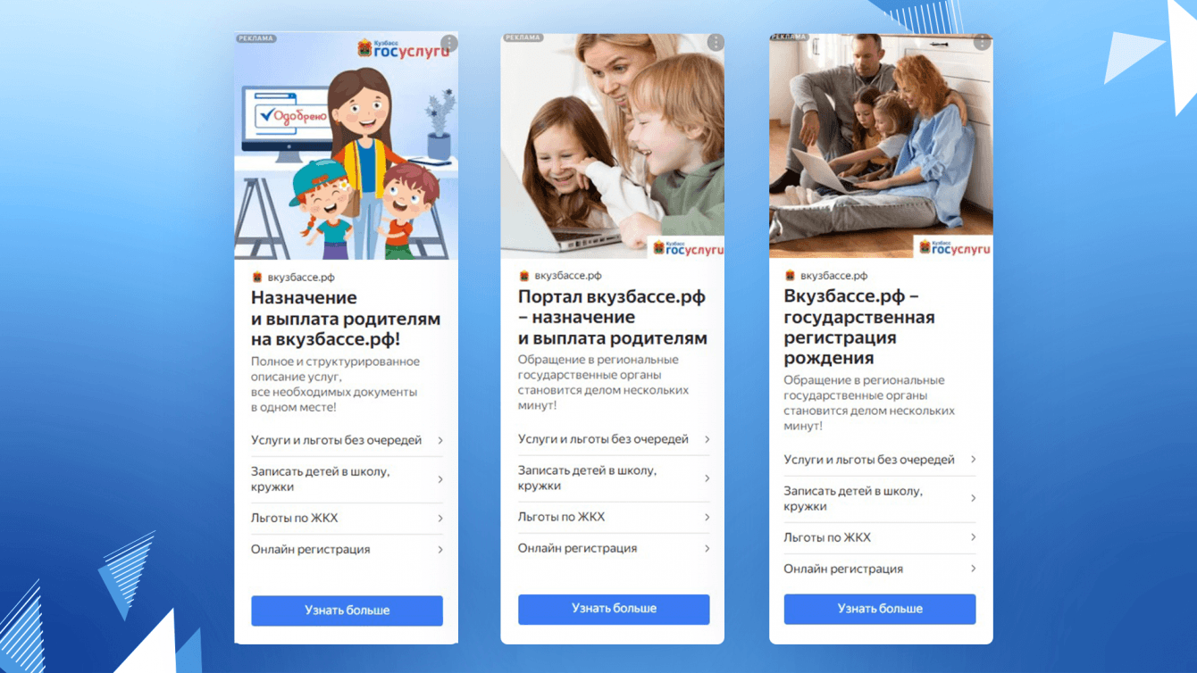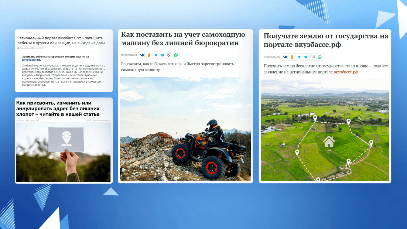 В контентной стратегии был сделан упор на удобстве получения государственных и муниципальных услуг на региональном портале. Сделан акцент на простоте и легкости использования, а также на преимуществах подачи заявлений на вкузбассе.рф по сравнению с обращениями в ведомства в формате оффлайн: теперь никаких очередей, часов ожидания и огромных папок с документами, на заполнение и отправку заявления на услугу достаточно 5 минут.