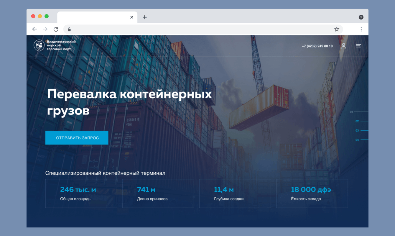 1. Создать корпоративный ресурс качественно иного уровня. Требовалось интегрировать новые наработки по фирменному стилю компании, а также предоставить пользователям сайта всю подробнейшую информацию о спектре услуг ВМТП.
