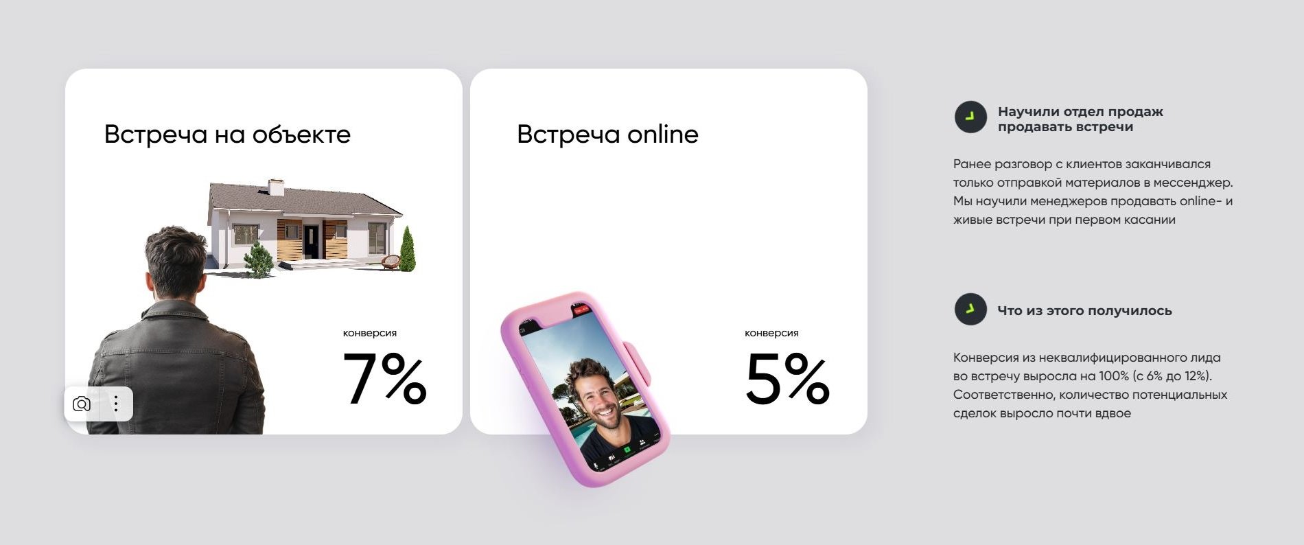 Конверсия из неквалифицированного лида во встречу выросла на 100% (с 6% до 12%). Соответственно, количество потенциальных сделок выросло почти вдвое.