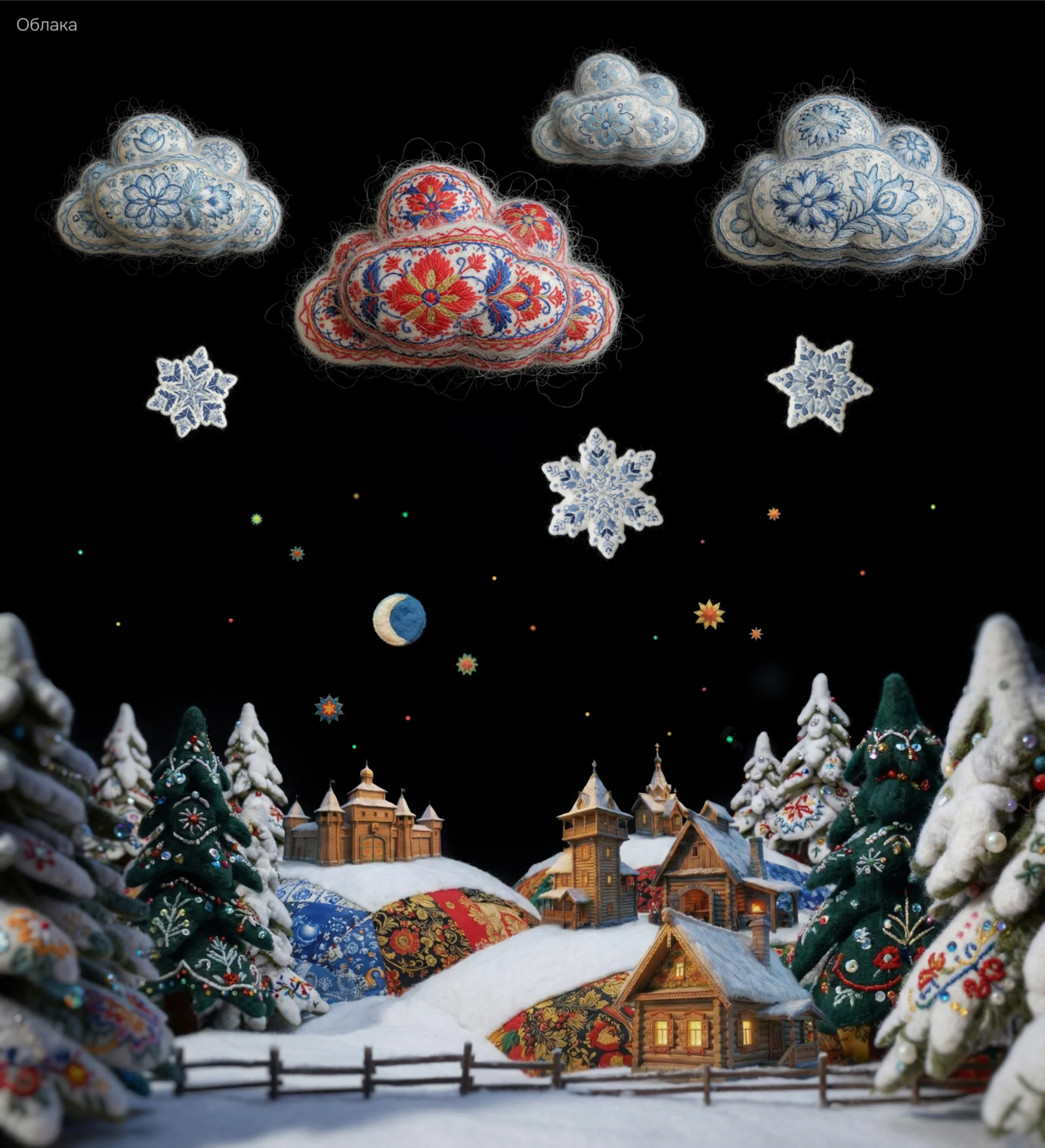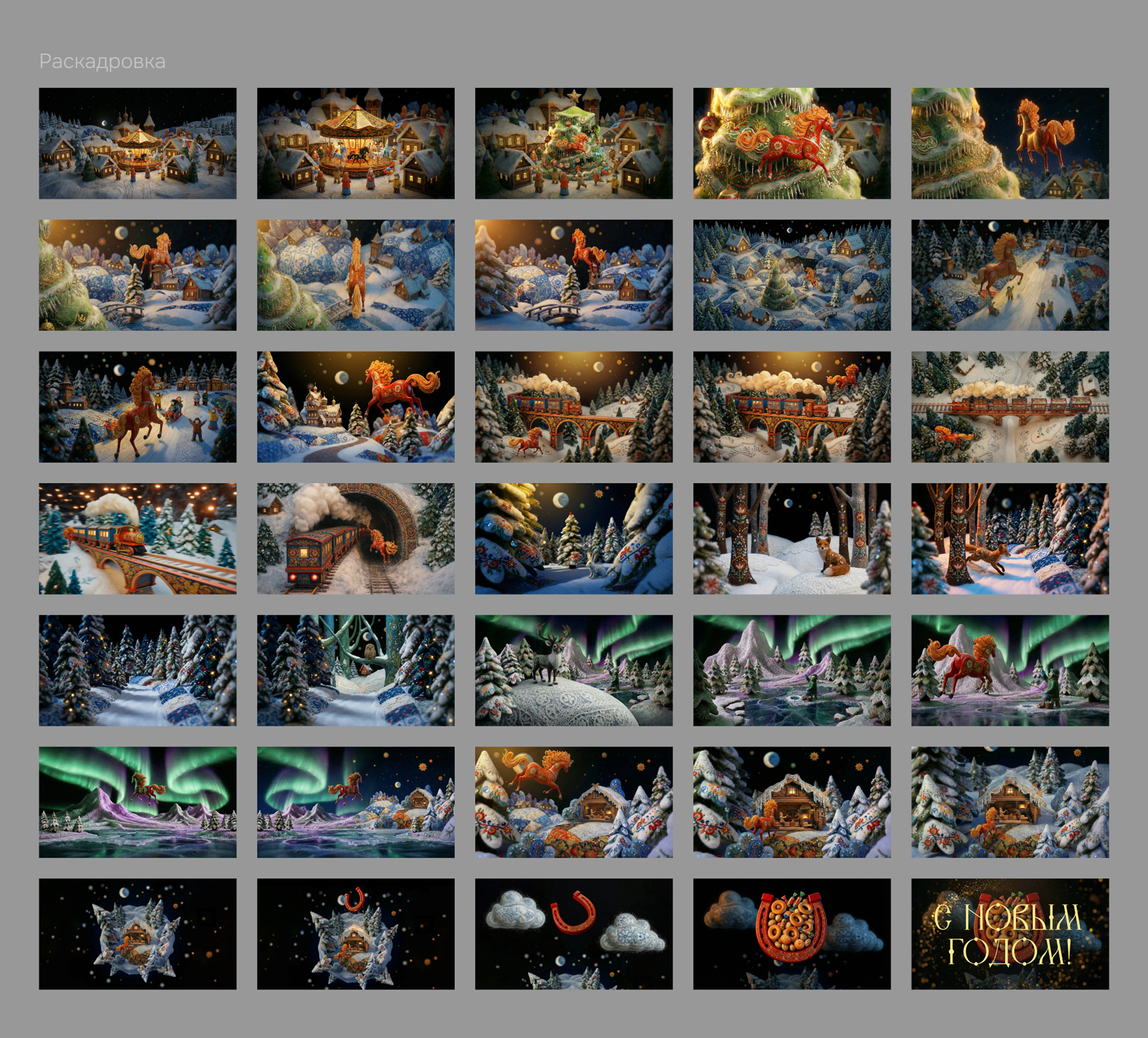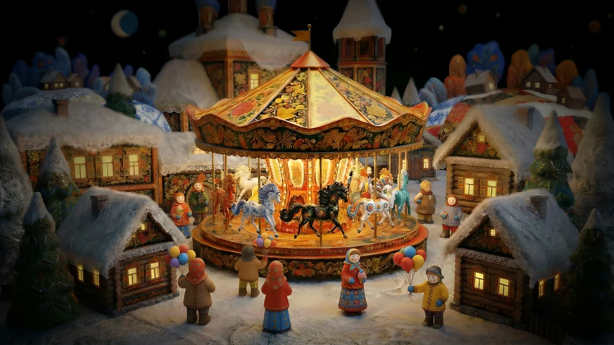 Для иллюстрации временного побега от рутины мы придумали историю про деревянную лошадку, сбегающую с новогодней карусели, чтобы совершить сказочное путешествие сквозь зимнюю ночь, наполненную волшебными пейзажами и их обитателями. Стилистическим решением, призванным создать ощущение праздника, была нейросетевая имитация знакомых с детства советских кукольных мультфильмов, которыми телевизор щедро одаривал детей в новогодние каникулы.