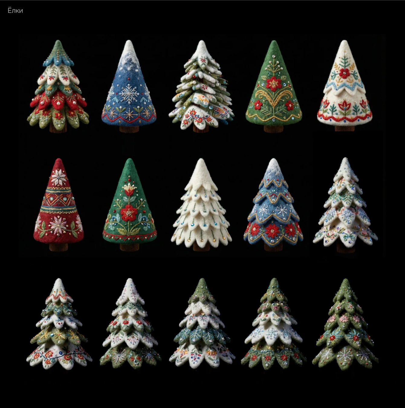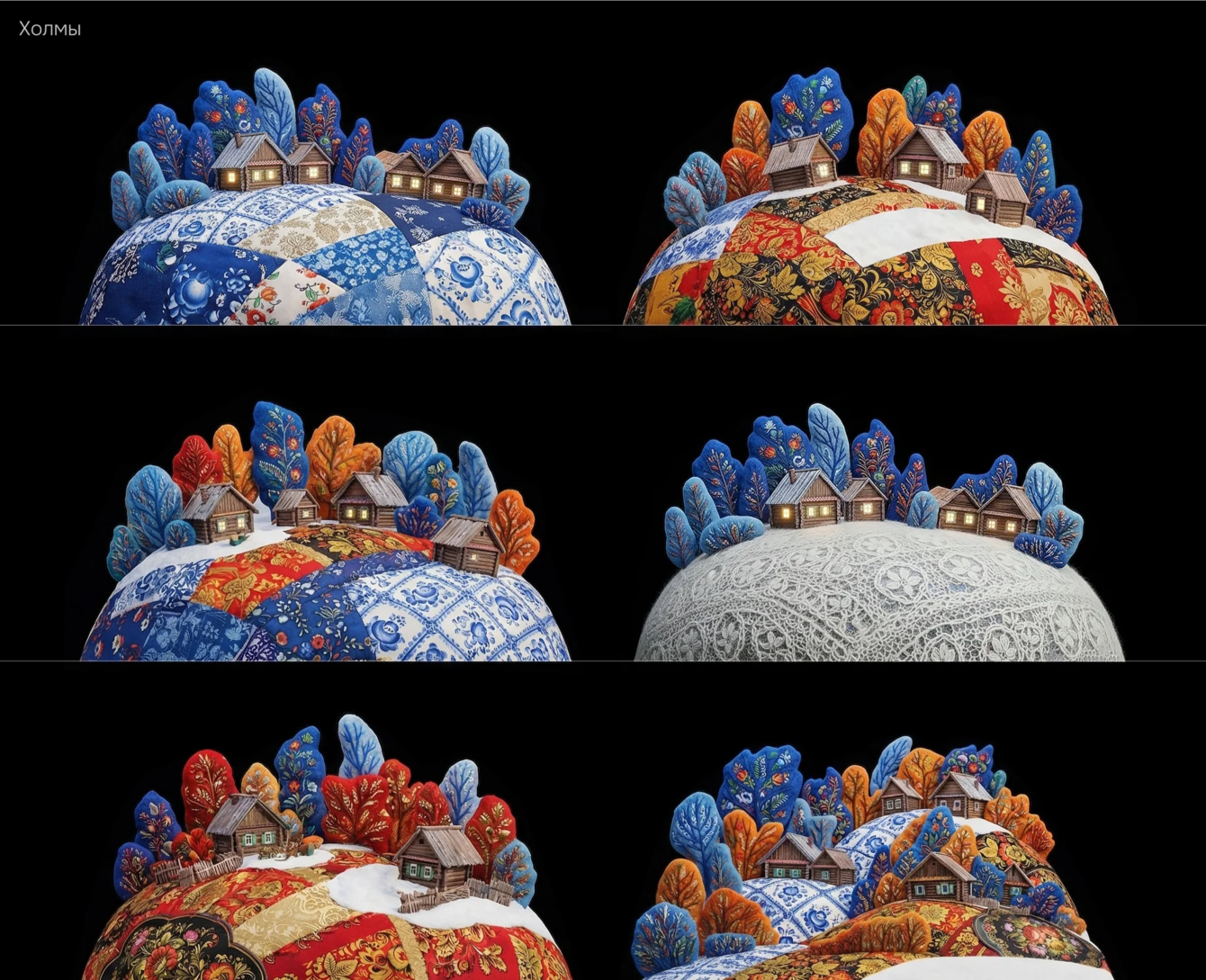 Соединить элементы в произвольные локации предоставили нейросетям, с чем они успешно справились, создав атмосферу разгульного праздника и полета через загадочные леса и уютные селенья. Вместо ожидаемой эклектики мы получили насыщенную цветами и текстурами, но вполне цельную мозаику.