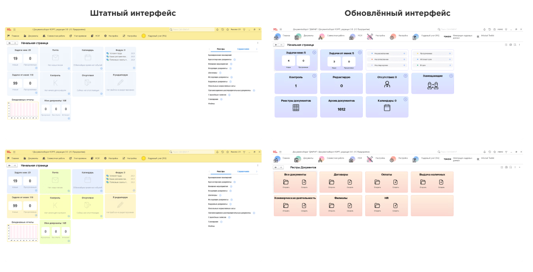 Заказчик решил настроить продукт под точечные запросы команды с точки зрения управления функциями и дизайном системы. Он поручил нам создать кастомный корпоративный интерфейс для 1С: ДО.