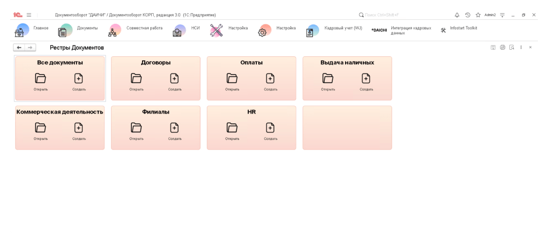 Пользователю доступны градиентные кнопки (виджеты). Работает иконка, позволяющая открывать и создавать элементы. Если мы откроем виджет «Все документы», запустится форма списка документов. Можно перейти в документы по коммерческой деятельности, создать новые, например, договор.