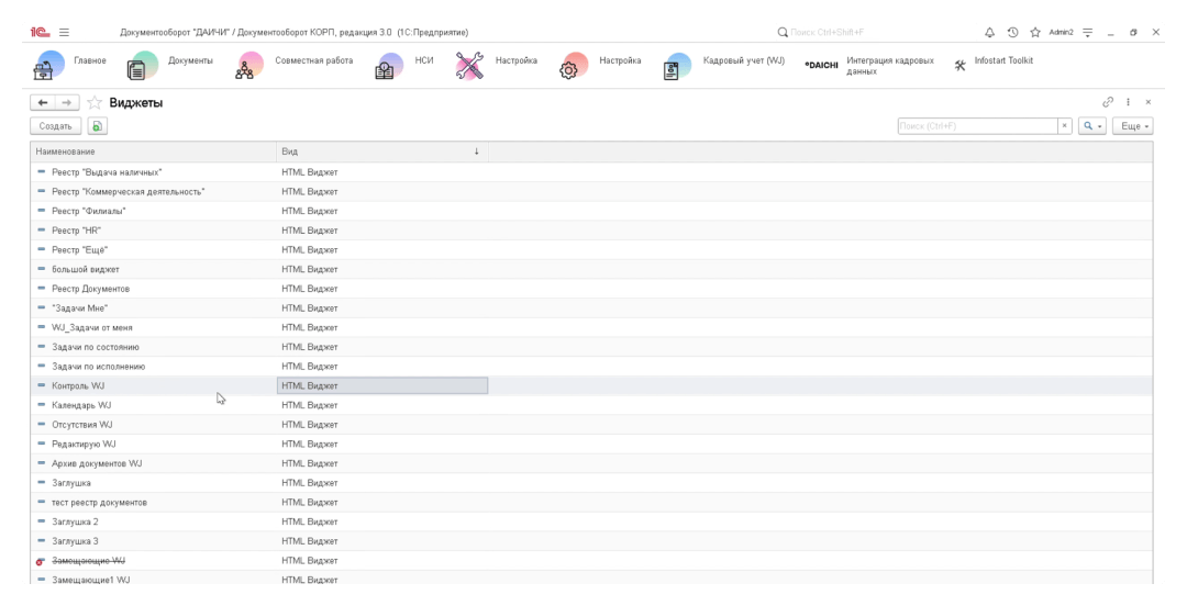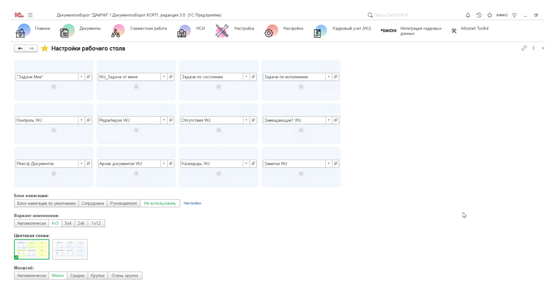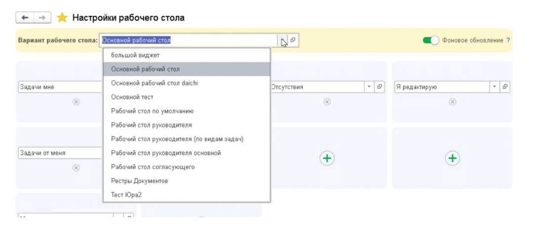В работе столкнулись с проблемой хранения данных. Системе нужно где-то хранить состав нового рабочего стола, чтобы создавать наборы кастомных виджетов. Мы сделали вариант рабочего стола в реестре документов, можно по кнопке переключиться на него. Штатный рабочий стол также доступен пользователю для работы.