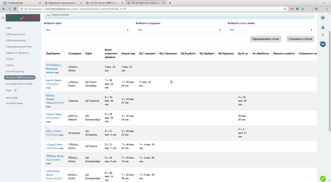 Заказчика помимо трудозатрат на обработку лидов и сделок также интересовало время, которое было затрачено на коммуникации с клиентами. Для отображения информации о затраченном времени разработли отчет: