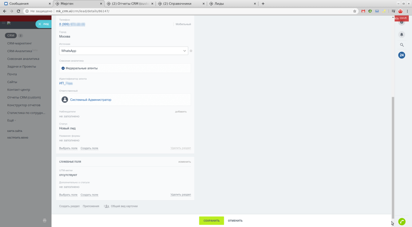 Часть источников, откуда поступает информация по лидам, имеет детализацию. Для этого создаются свойства типа «Справочник», в котором хранятся уточняющие значения для конкретного источника. По умолчанию все такие свойства сущности (лид, сделка) на странице принудительно скрываются. В случае, если пользователь выбирает источник, для которого есть уточняющее свойство «Справочник», то оно автоматически отображается в сущности CRM.