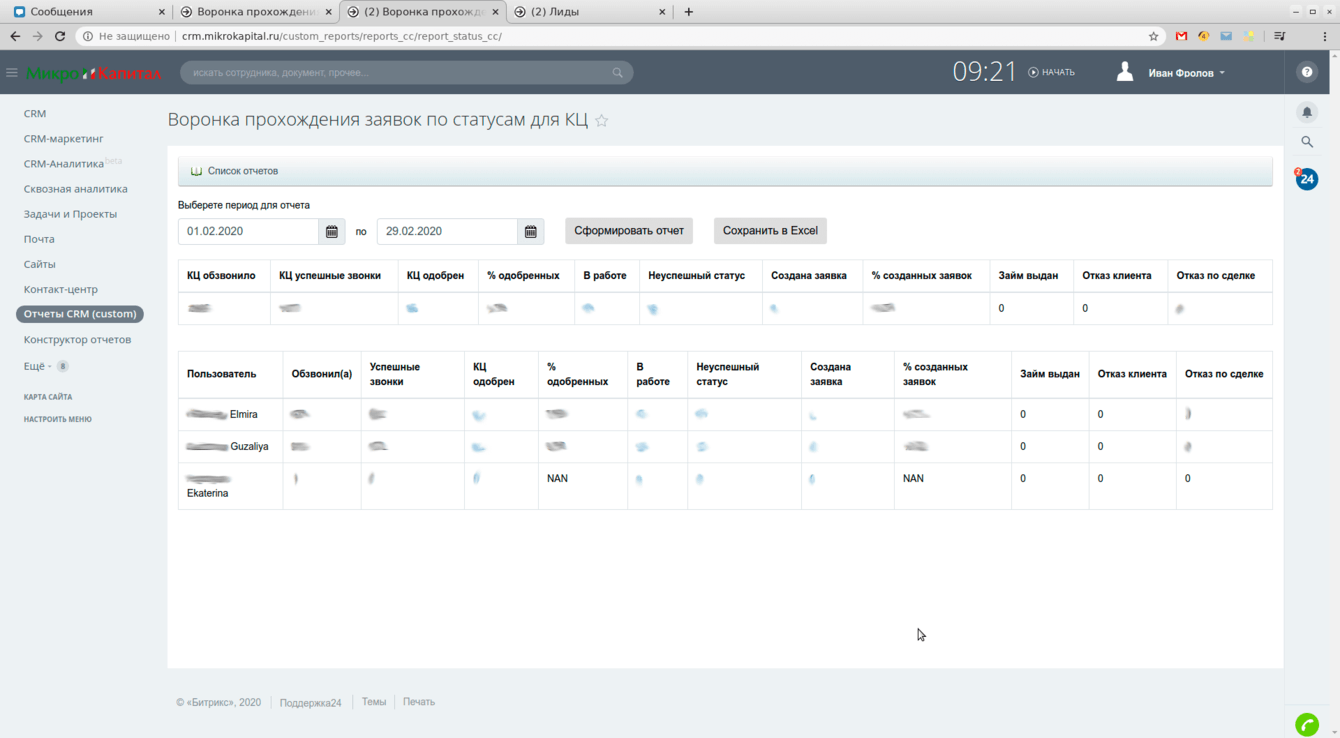 В компании есть собственный колл-центр. В разрабатываемом отчете требовалось вывести данные по среднему количеству звонков сотрудников в час (всего, входящих, исходящих), среднее время разговора с потенциальными клиентами, пропускаемое количество звонков в рабочее время. Также заказчику необходимо было реализовать возможность оценки качества обработанных колл-центром лидов. Для этого разработали отчет, который выводит информацию о дальнейшем статусе одобренных лидов. Для некачественных лидов, с которыми работали сотрудники колл-центра, дополнительно реализован отчет с разбивкой по причине отказа и детализацией данной причины: