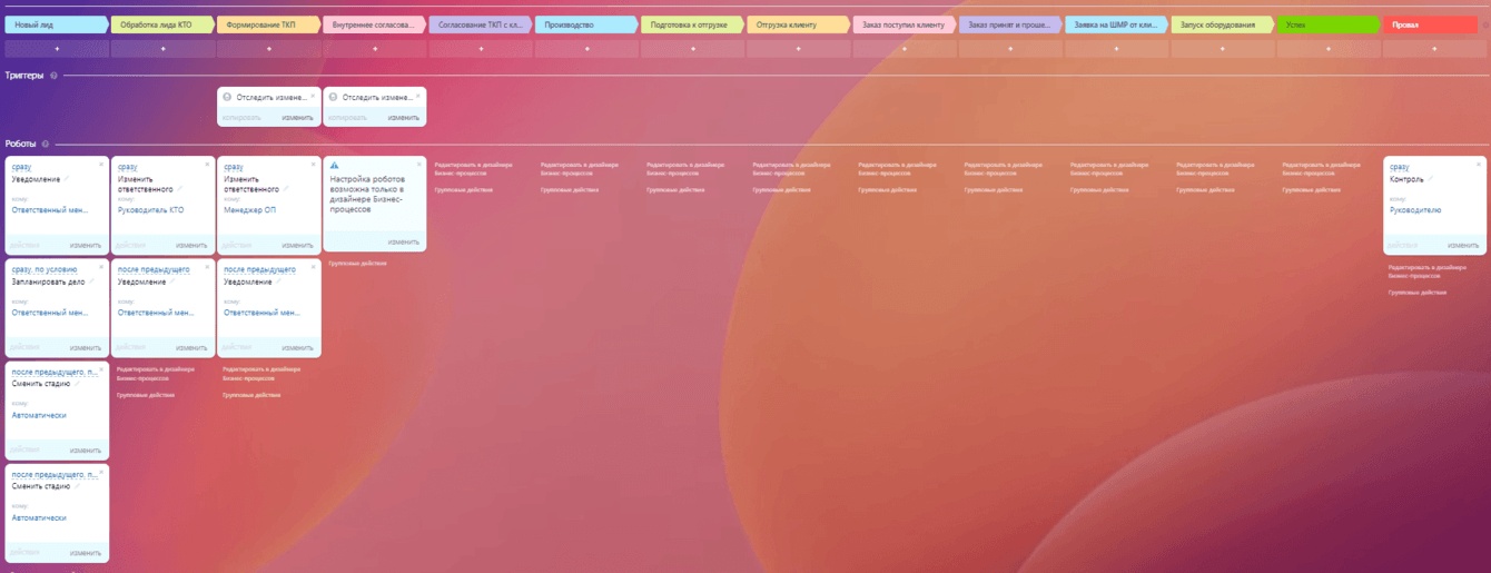 1. Создали общую воронку продаж и карточки сделки — благодаря этому повысилась прозрачность и контроль над всеми этапами процесса продаж, улучшилась координация между отделом продаж и другими подразделениями.