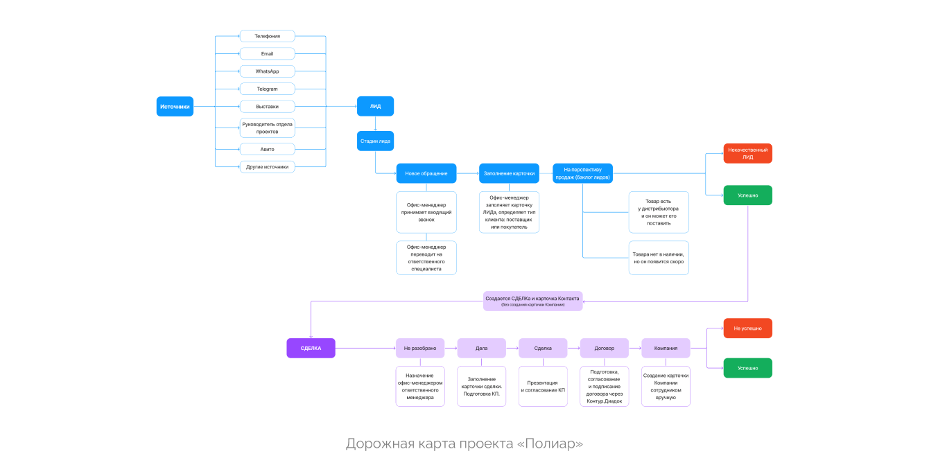 На первом этапе мы развернули платформу и провели анализ бизнес-процессов. Далее в соответствии с результатами анализа разработали макет воронок сделок и лидов, полей контактов для CRM. После согласования с заказчиком настроили по макету воронки, поля, карточки контактов и компаний в Битрикс24.