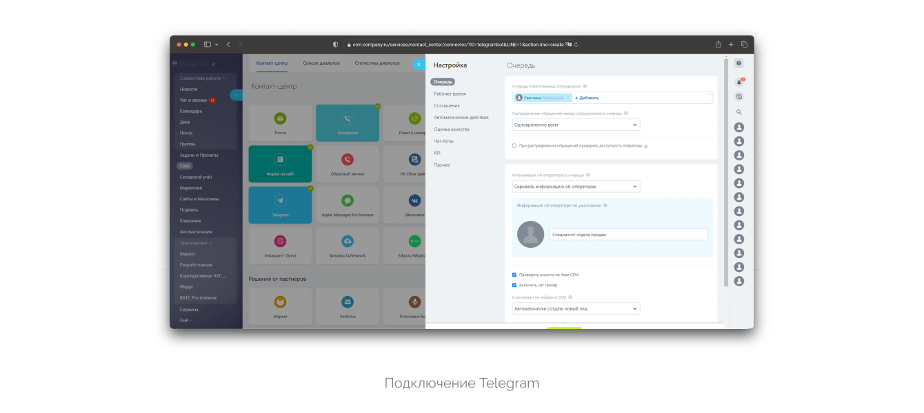 Подключение Telegram, Avito и электронной почты выполнено штатными модулями Битрикс24. Для подключения Avito (личные сообщения из чата) потребовался ID пользователя, для Telegram – API-токен, для почты – наименование агента, логин и пароль.