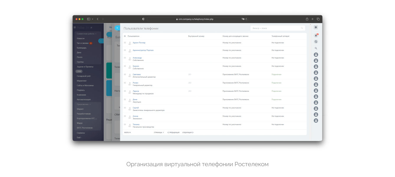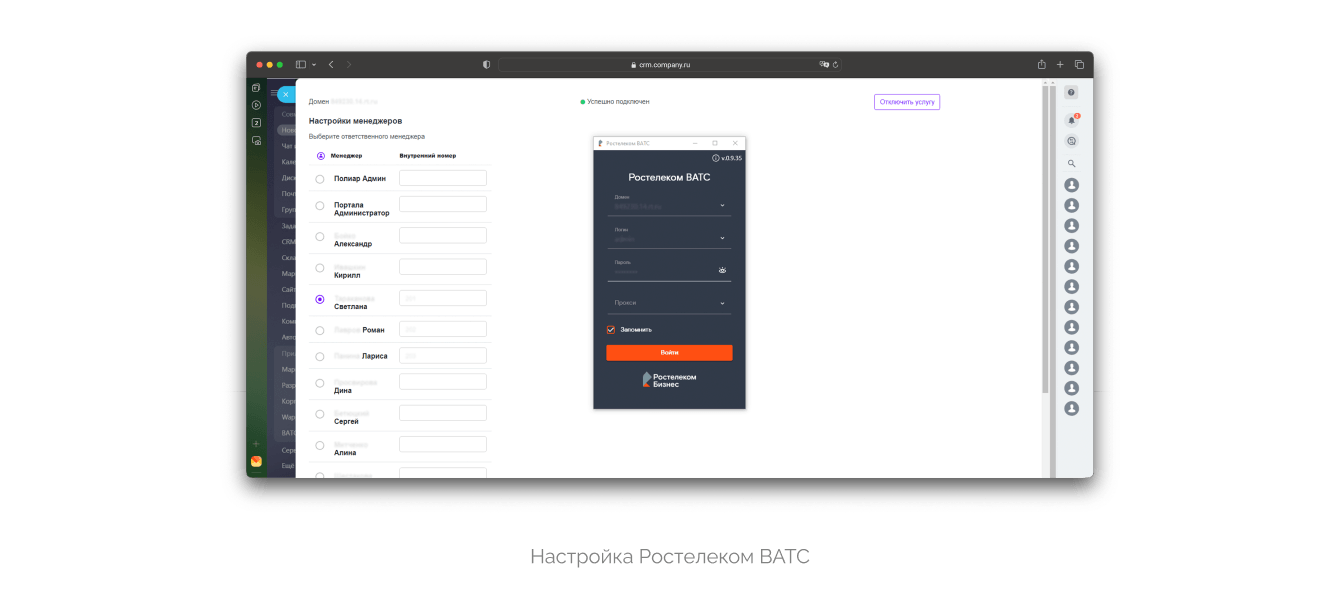 Телефонию «Ростелекома» можно подключить двумя способами – через SIP-коннектор и с помощью программной звонилки на компьютерах. Мы пока решили ограничиться вариантом со звонилкой-приложением, которое предоставляет оператор. Оттуда звонок автоматически вносится в Битрикс24 через модуль ВАТС от «Ростелекома». Этот же модуль отвечает за настройки и распределение очереди.