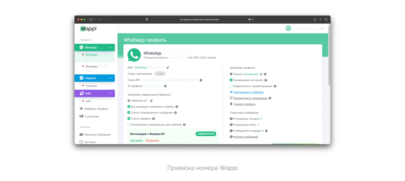 Для WhatsApp использовали модуль Wappi с Битрикс Маркета․ Это максимально простое приложение с синхронизацией в два клика – нужны только логин-пароль и API-ключ. Привязка номера – на стороне личного кабинета Wappi․ Модуль умеет работать также с Telegram и Avito, однако он платный, за каждый из подключенных сервисов взимается абонентская плата. Мы выбрали наиболее выгодный вариант – бесплатные штатные модули.