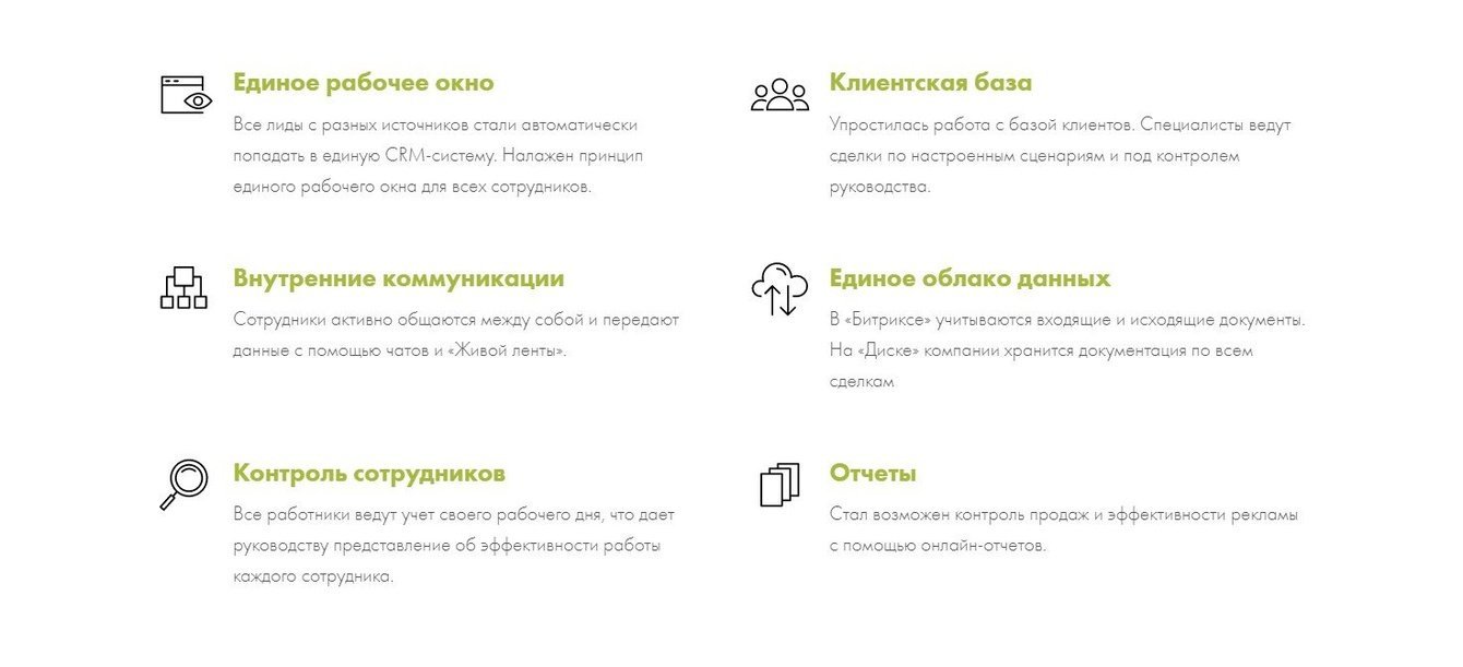 Были проанализированы бизнес-процессы в компании и составлены схема движения лидов и этапы в сделках. На каждом этапе настроены необходимые тригеры и роботы, которые помогают менеджерам не затягивать сроки выполнения действий по заказу.