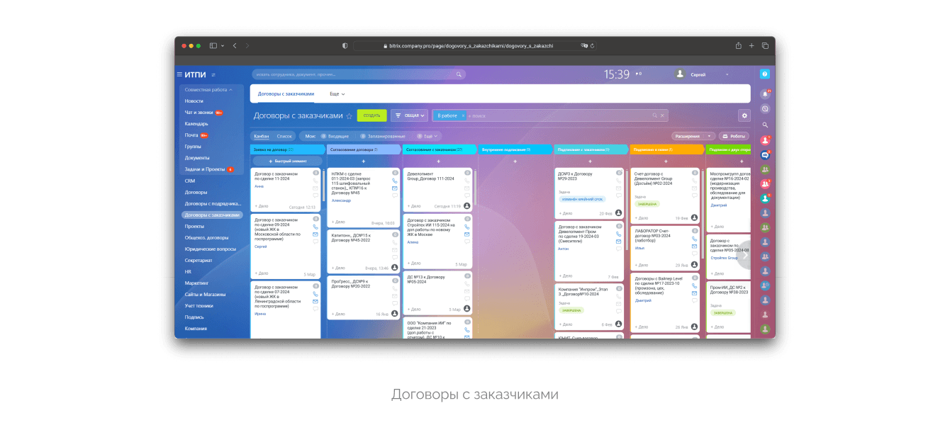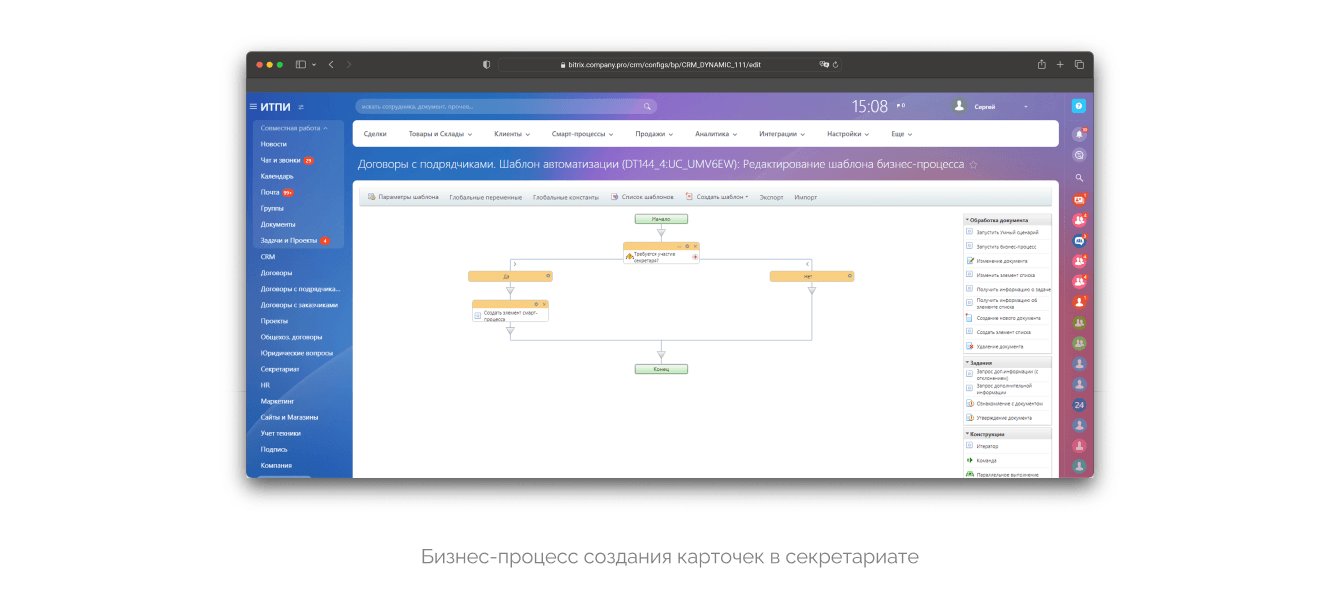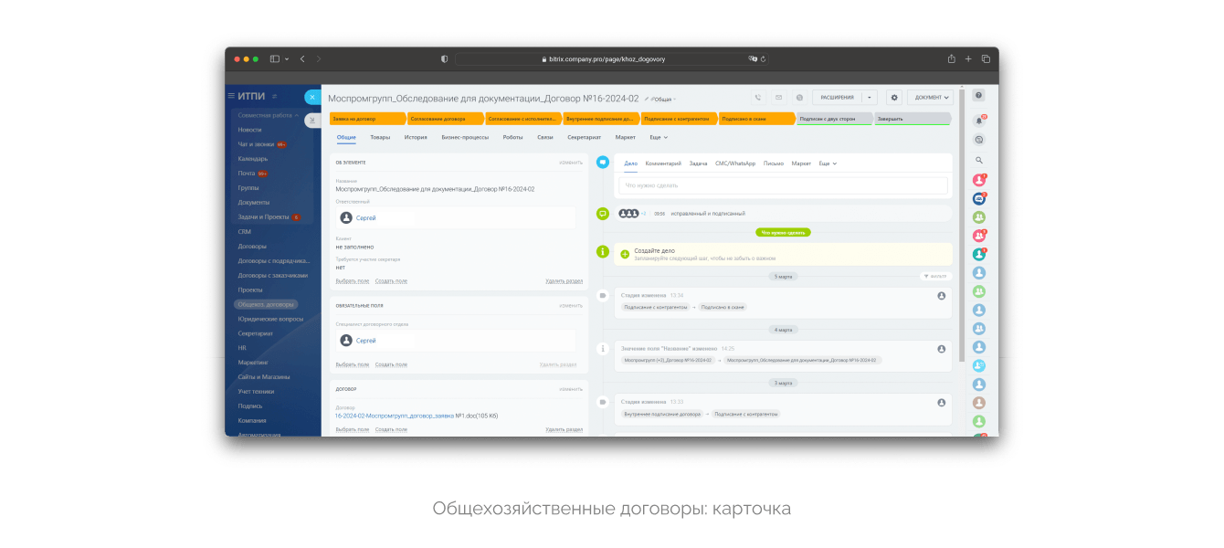 1. Смарт-процессы для работы с договорами (с подрядчиками, с заказчиками, общехозяйственные). Изначально все виды договоров обрабатывались в общем потоке, что вело к путанице. Были созданы отдельные рабочие зоны для градации документов по их типу. Классификация выполняется отделом продаж, который обрабатывает все заявки по сделкам. Смарт-процессы обеспечивают стадийность проведения сделки и подключение нужных сотрудников к тем этапам, где необходимо их участие.