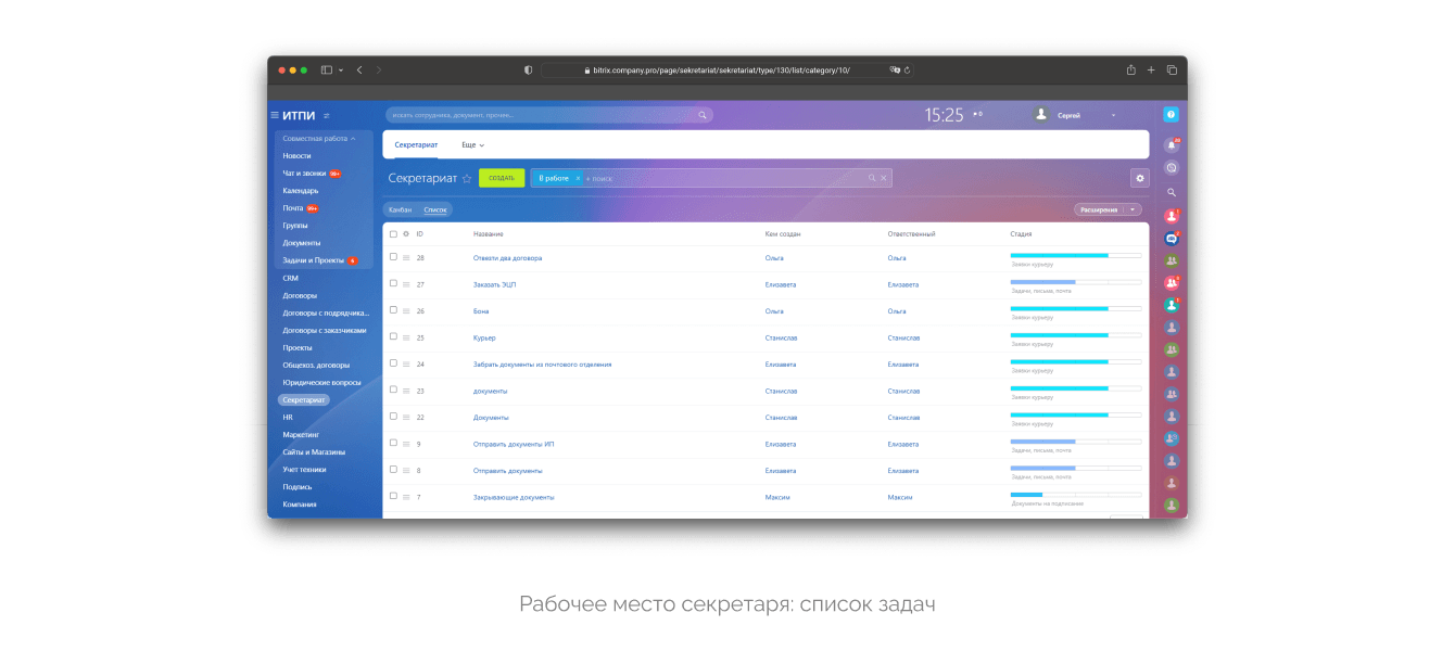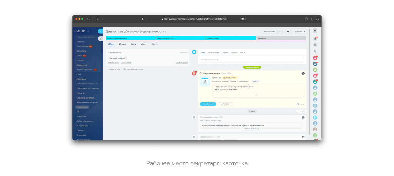 Благодаря внедрению Битрикс24 специалисты заказчика получили отдельные рабочие места, где осуществляются процессы обработки договоров и проектов. Юридический отдел и отдел кадров получили не привязанные к функционалу CRM рабочие места․ Автоматизация позволила сократить время создания карточки в смарт-процессе за счет автозаполнения полей и вложенности документов, сократилось время передачи договоров в работу и их сопровождение. С помощью календарного графика руководители компании имеют возможность отслеживать работу отдела продаж и других подразделений, стадии ведения сделок и проектов, движение документов в юридическом отделе и секретариате.