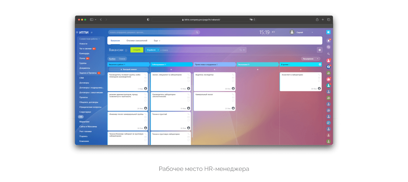 2. Рабочее место HR-менеджера. Задачи отдела кадров обособлены от основного бизнеса, поэтому было решено создать для него отдельное рабочее пространство. Оно состоит из двух категорий – вакансии и отклики. Это система учета, облегчающая работу HR и позволяющая руководству отслеживать процессы найма.