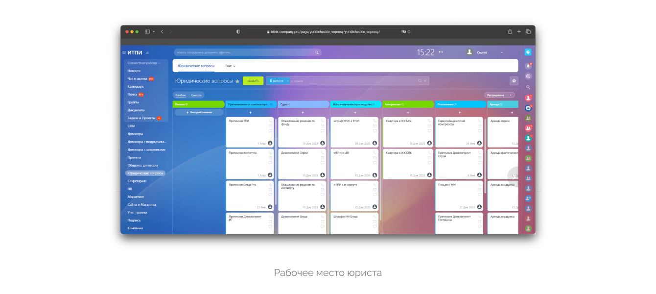 3. Рабочее место юриста. Юридические вопросы, не связанные со сделками – иски, банкротства, претензии, штрафы, обжалования, аренды – также выведены в отдельный смарт-процесс.