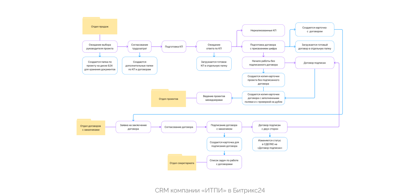 Была проведена работа по настройке бизнес-процессов для создания и хранения в отдельных папках на диске договоров и коммерческих предложений.