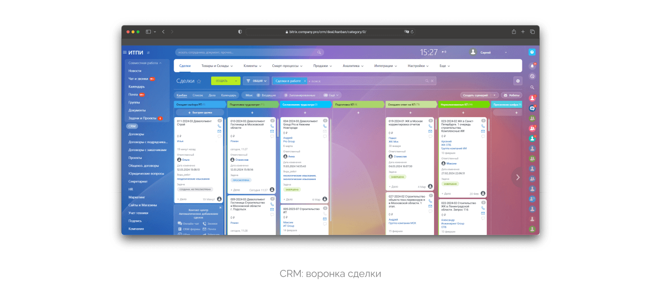 После внедрения системы, добавления всех сотрудников, настройки CRM и базовой автоматизации процессов стали очевидны новые задачи. В старой системе все сделки находились на одной доске, что затрудняло работу специалистов конкретных направлений. Было принято решение разделить эти направления на воронки. Кроме того, возникла необходимость добавить смарт-процессы для работы с договорами. В результате на втором этапе был проведен ряд работ по расширению функционала системы и повышению ее эффективности по сравнению с прошлым решением.