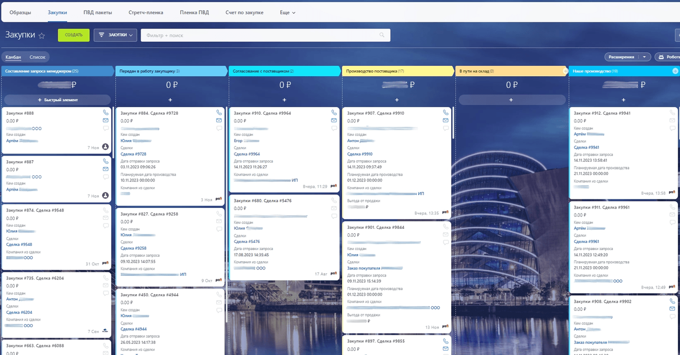 Закупщик ведет заявки по своей воронке, а менеджер видит статусы и получает автоматические уведомления.