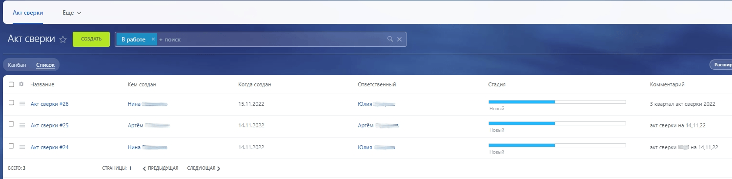 Бухгалтер составляет запрос, а менеджер получает уведомление о необходимости отправить акт клиенту. Таким образом всегда можно посмотреть, все ли отправлено и ничего не забыть.