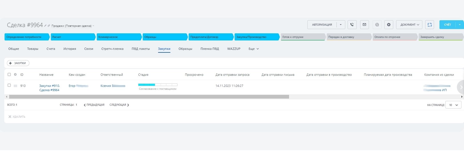 Очень удобно, когда менеджеру отдела продаж прям из своей сделки можно посмотреть заявки на закупки и их статус.